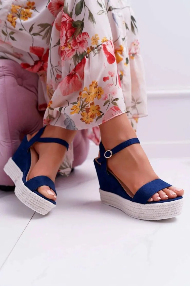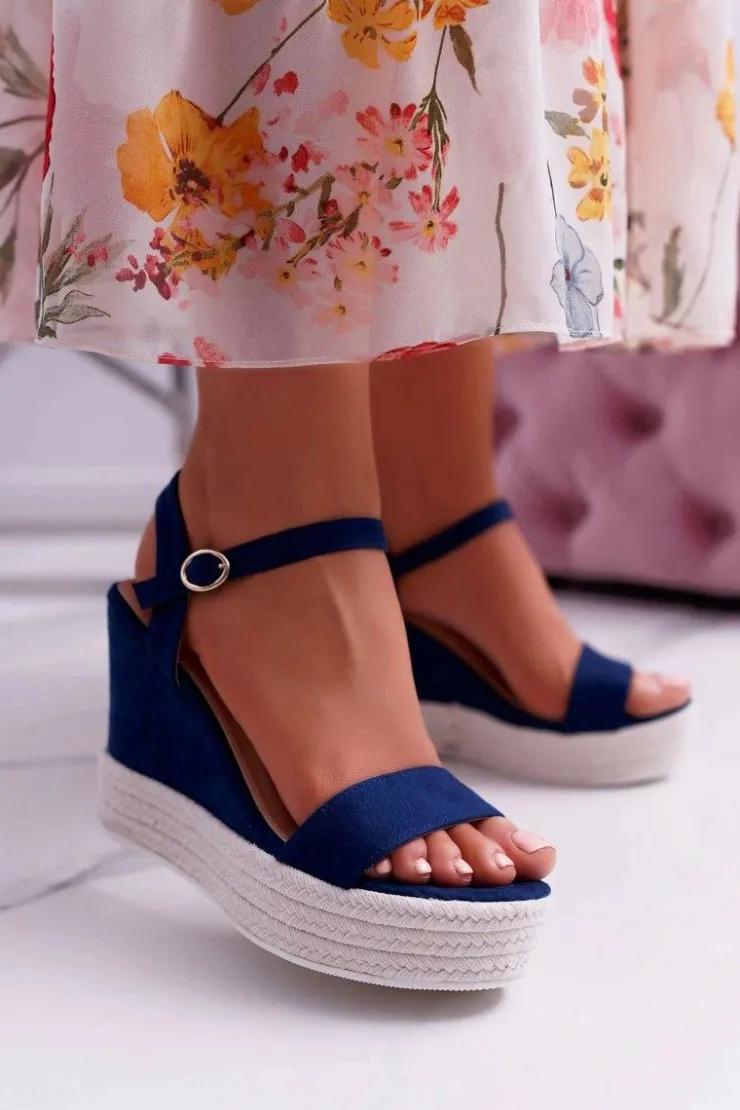 Clearance Boto Sandały Damskie Na Koturnie Lniane Granatowe Liviana