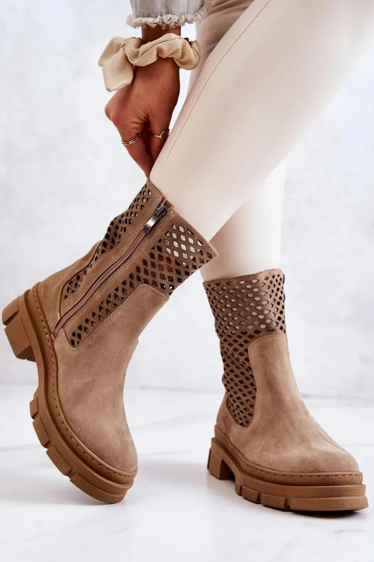 Damskie botki firmy Nicole zostały wykonane w całości ze skóry naturalnej. Przyjemny i wygodny zamsz zapewni wyjątkowy komfort. Zapinane na zamek błyskawiczny. Antypoślizgowa podeszwa w stylu workerów zapewni stabilność na każdym kroku. Cholewka posiada ażurowy wzór. Koniecznie sprawdź pozostałe nasze modele marki Nicole! Przy wyborze rozmiaru prosimy sugerować się tabelą rozmiarów.