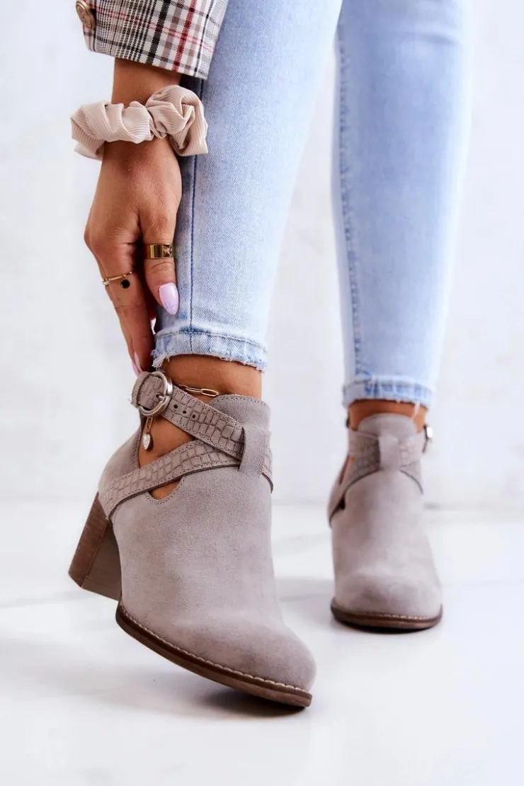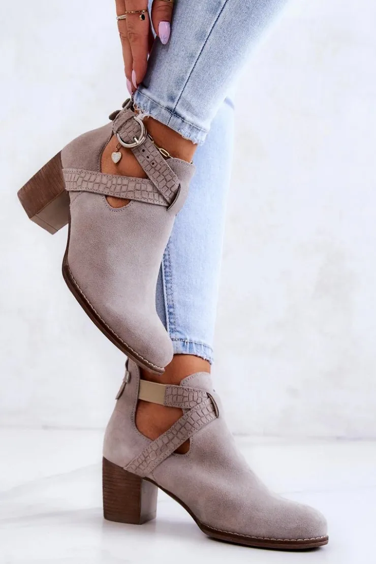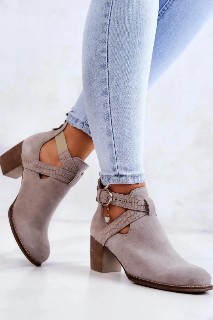 Botki wykonane z naturalnej zamszowej skóry z wycięciami po bokach cholewki. Wkładka wykonana z naturalnej skóry, co sprawia, że są bardzo komfortowe podczas użytkowania. Z boku cholewki znajduje się także regulowany pasek zapinany na sprzączkę oraz gumka. Obcas w postaci słupka. Tłoczona faktura oraz modny fason sprawiają, że te buty wyglądają naprawdę wyjątkowo. Nosek zamknięty, zaokrąglony. Koniecznie sprawdź także pozostałe modele skórzanych butów dostępnych w naszej ofercie! Przy wyborze rozmiaru prosimy sugerować się tabelą rozmiarów.