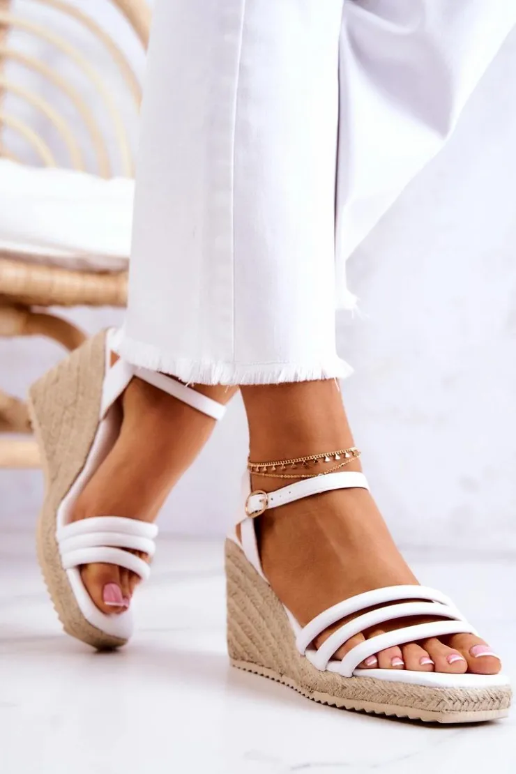 Sandały na koturnie oraz niskiej platformie. Odkryty, kwadratowy nosek. Zapinane na wysokości kostki na regulowany pasek ze sprzączką. Palce podtrzymują trzy, oddzielne paski. Wykonane z eko skóry. Miękka, wykonana także z eko skóry wkładka jest bardzo wygodna w użytkowaniu nawet przez cały dzień. Platforma jest przyozdobiona jutowym warkoczem. To buty, które będą znakomitym dodatkiem do letniej sukienki. Przy wyborze rozmiaru prosimy kierować tabelą rozmiarów.