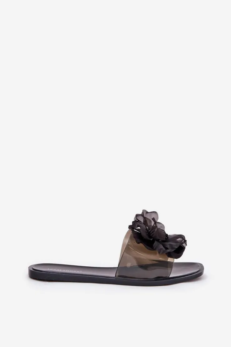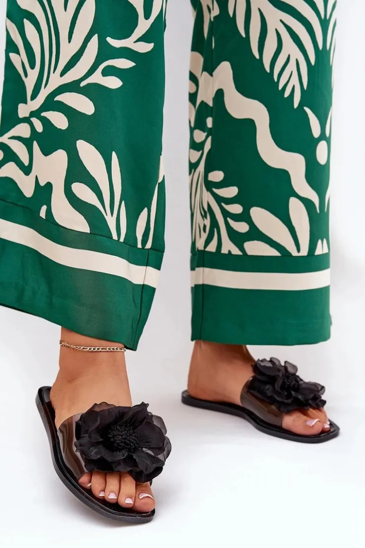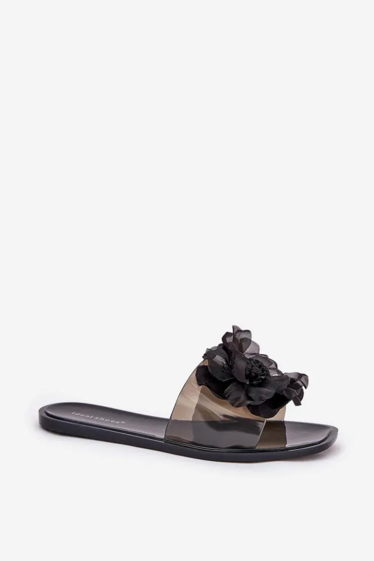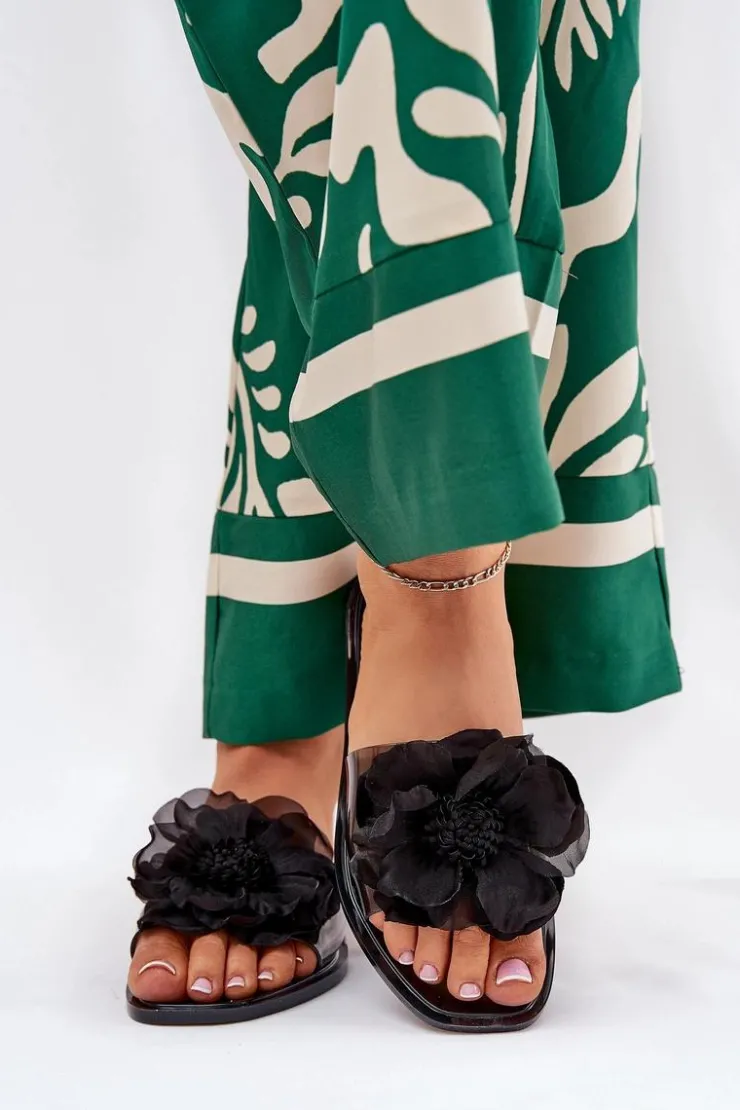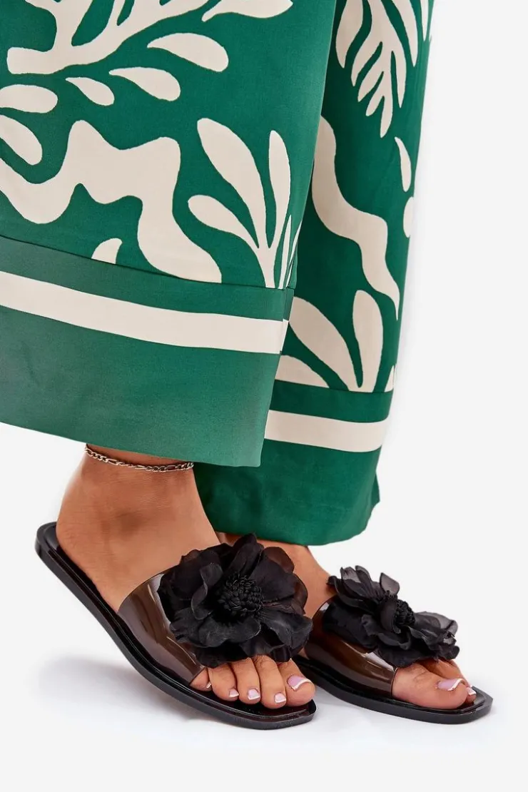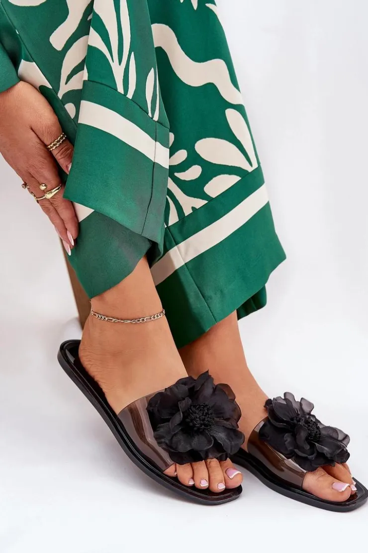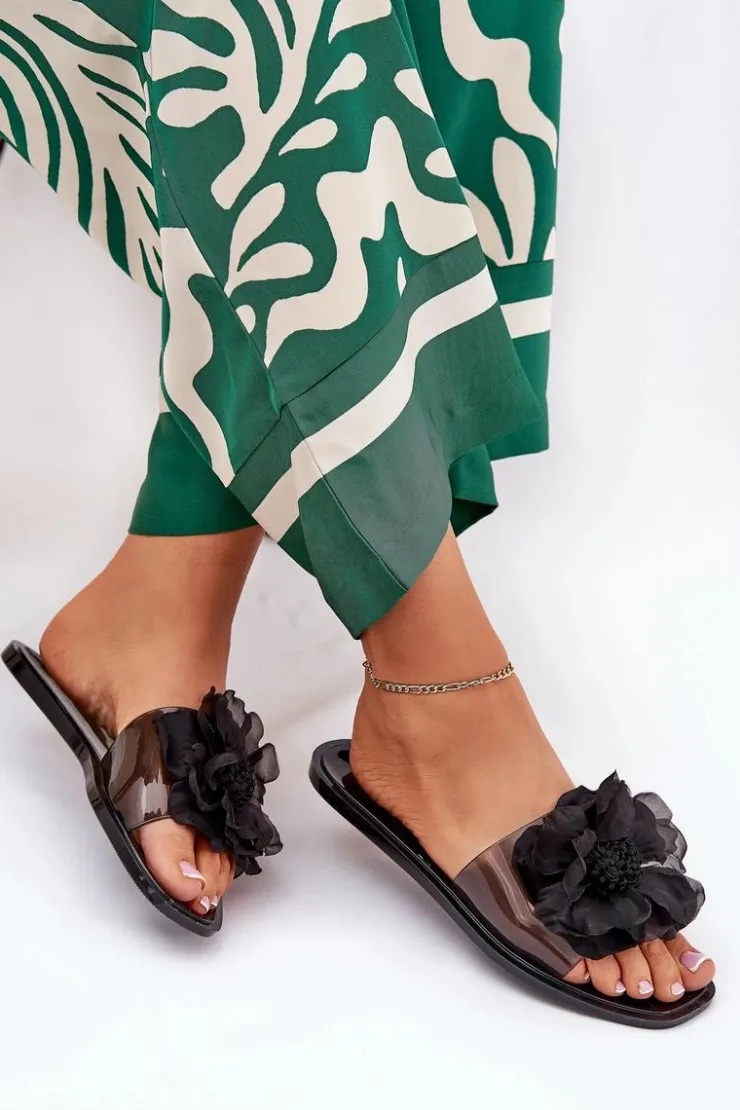 Stylowe klapki damskie o transparentnej cholewce, które wyróżniają się lekkością i nowoczesnym wyglądem. Osadzone na płaskiej podeszwie, zapewniają wygodę na co dzień. Z przodu buty zdobi uroczy sztuczny kwiatek, który dodaje im subtelnej kobiecości i świeżości. Idealne na letnie dni, doskonale komponują się z lekkimi sukienkami, spódnicami lub szortami, wprowadzając odrobinę elegancji i świeżości do każdej stylizacji. Przy wyborze rozmiaru prosimy sugerować się tabelą rozmiarów.