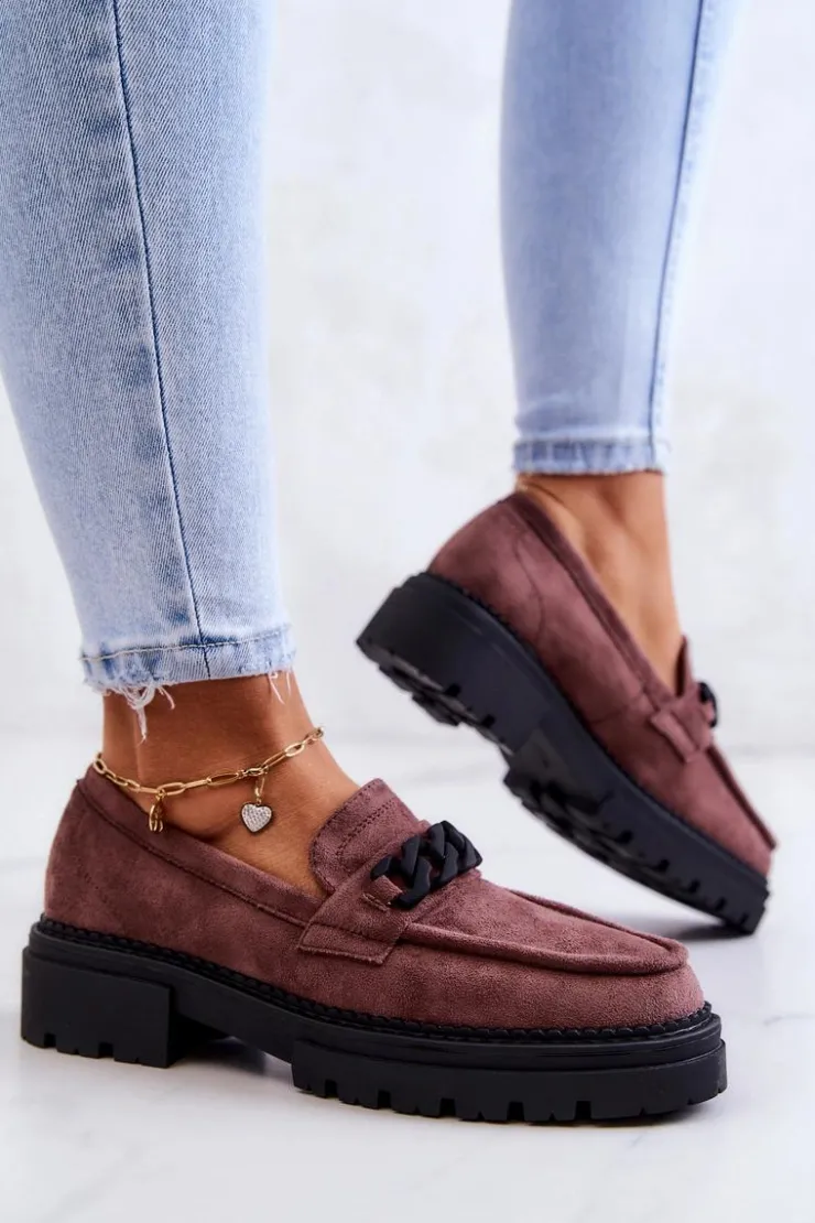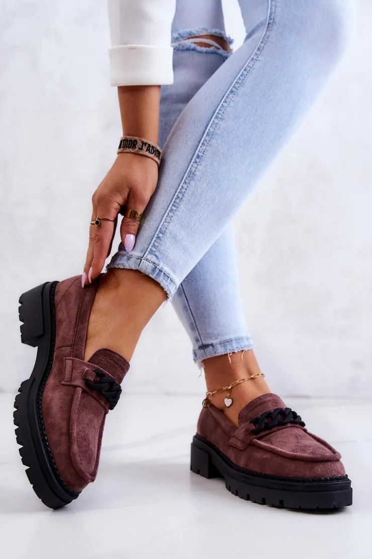 Klasyczne półbuty w stylu przepięknych loaferów marki Laura Fiore! Buty zostały wykonane z wysokiej jakości zamszowej eko skóry. Charakterystyczne zdobienie w postaci łańcucha sprawi, że stworzymy z nimi wiele wspaniałych stylizacji. Posiadają wysoką podeszwę oraz obcas, który uniesie naszą sylwetkę. Miękka wykonana z naturalnej skóry wkładka zadba o komfort podczas użytkowania obuwia. Przy wyborze rozmiaru prosimy sugerować się tabelą rozmiarów.
