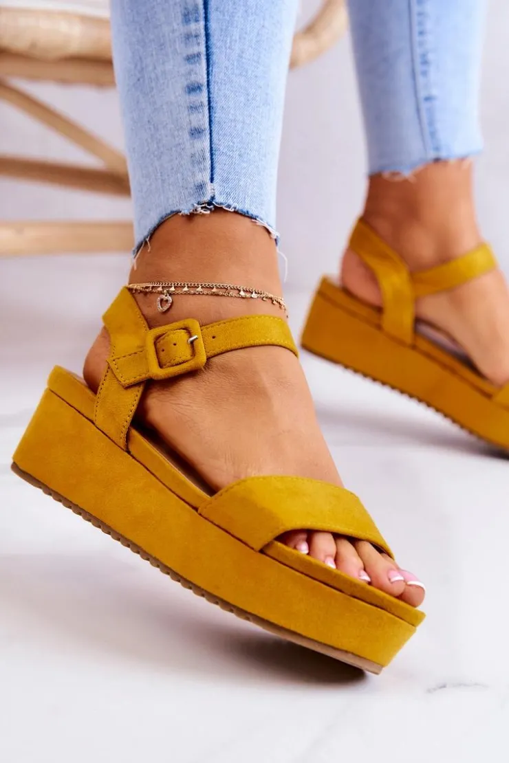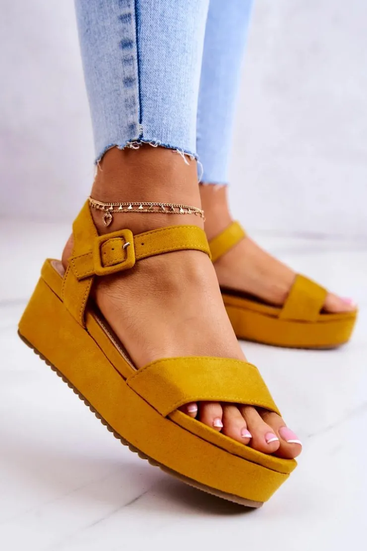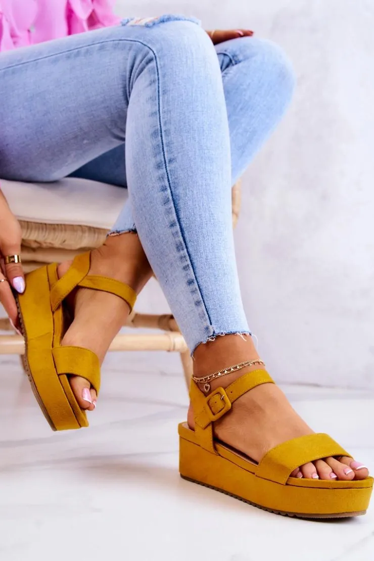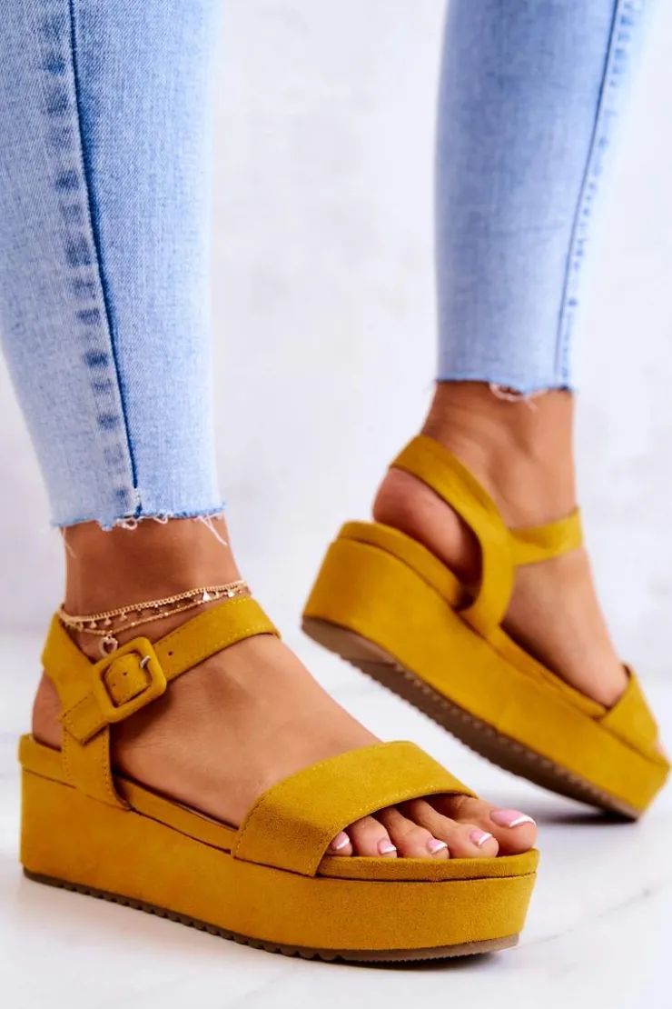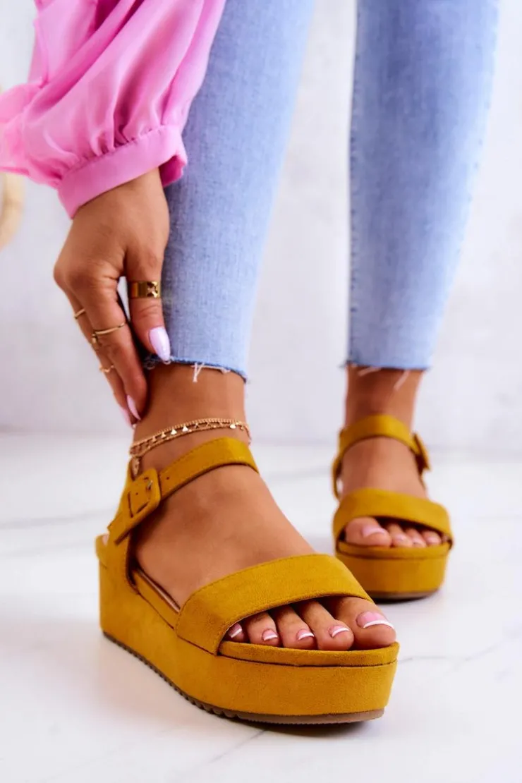 Sandały na koturnie i masywnej platformie świetnie wpasują się w letnie trendy! Zapinane na klamrę na wysokości kostki z regulowanym paskiem. Sandały posiadają paseczki podtrzymujące stopę. Podeszwa posiada żłobienia i została wykonana z gumowego tworzywa. Dodatkowo jest antypoślizgowa. Z zewnątrz sandały są wykonane z zamszowej eko skóry. Sandały te będą idealne do dłuższych spódnic czy sukienek. Eko skórzana wkładka zadba o Twój komfort i wygodę. Przy wyborze rozmiaru prosimy sugerować się tabelą rozmiarów.