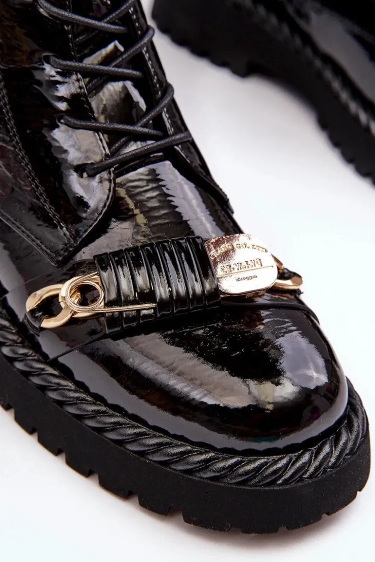 Damskie botki w stylu workerów zostały wykonane z wysokiej jakości eko skóry. Posiadają suwak z boku cholewki ułatwiający zakładanie obuwia. Botki osadzono na płaskim obcasie oraz delikatnej platformie ze żłobieniami. Posiadają w środku ocieplenie kocem obuwniczym. Z przodu złote ozdoby z tworzywa sztucznego. Ten model na pewno wykorzystasz w wielu stylizacjach! Przy wyborze rozmiaru prosimy sugerować się tabelą rozmiarów.
