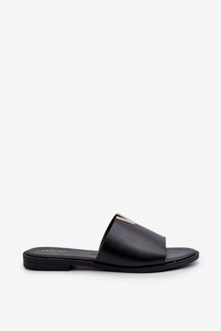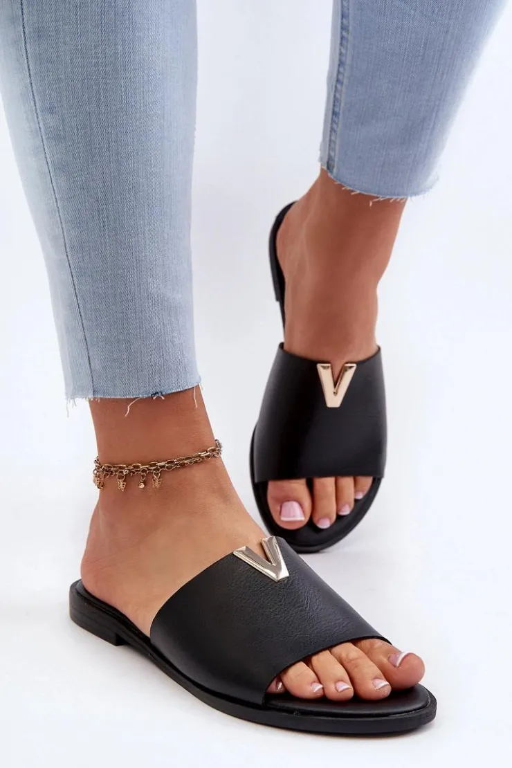 Klapki damskie wykonane ze skóry ekologicznej. Złoty element doda blasku Twojej letniej stylizacji. Osadzone na płaskim obcasie. Model ten będzie idealnym wyborem na wiele okazji! Przy wyborze rozmiaru prosimy sugerować się tabelą rozmiarów.