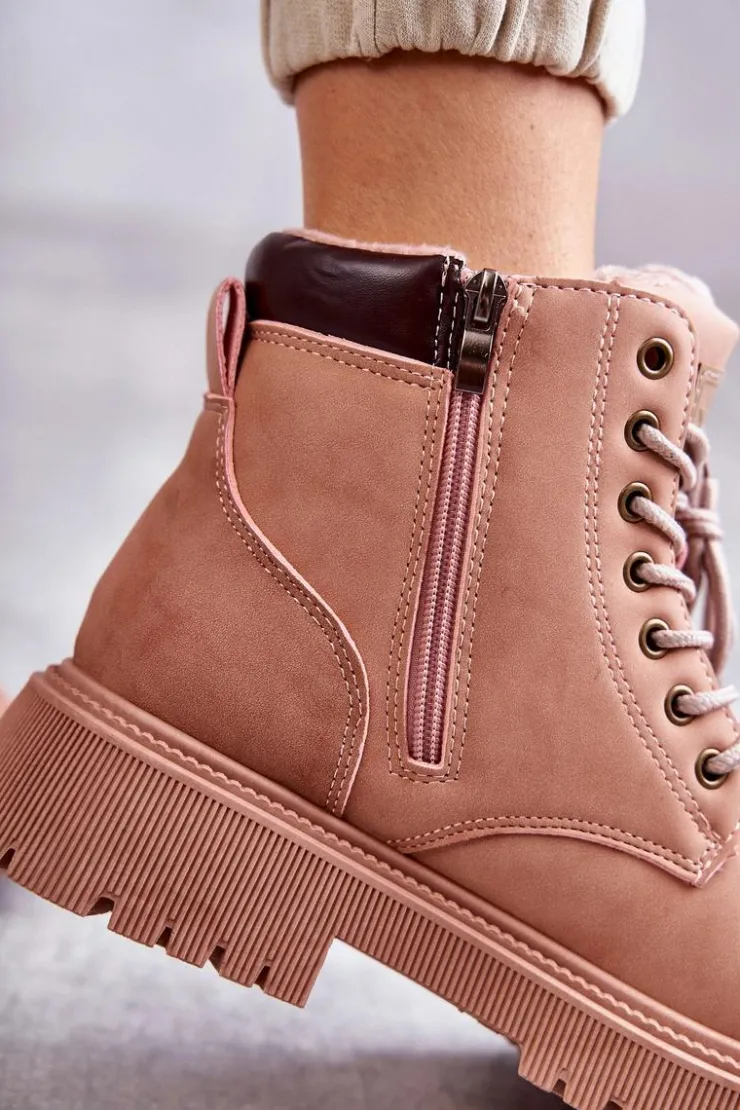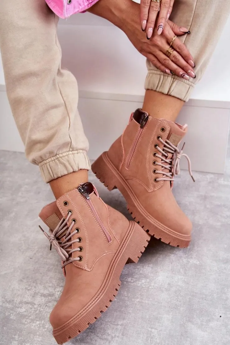 Botki w stylu traperów idealnie sprawdzą się na chłodniejsze dni! Zostały wykonane z eko skóry. Posiadają klasyczne sznurowanie oraz suwak z boku cholewki. Model z dodatkowo usztywnianym zapiętkiem. Ocieplone wewnątrz miłym w dotyku kocem obuwniczym. Trapery osadzono na delikatnej platformie oraz płaskim obcasie. Przy wyborze rozmiaru prosimy sugerować się tabelą rozmiarów.