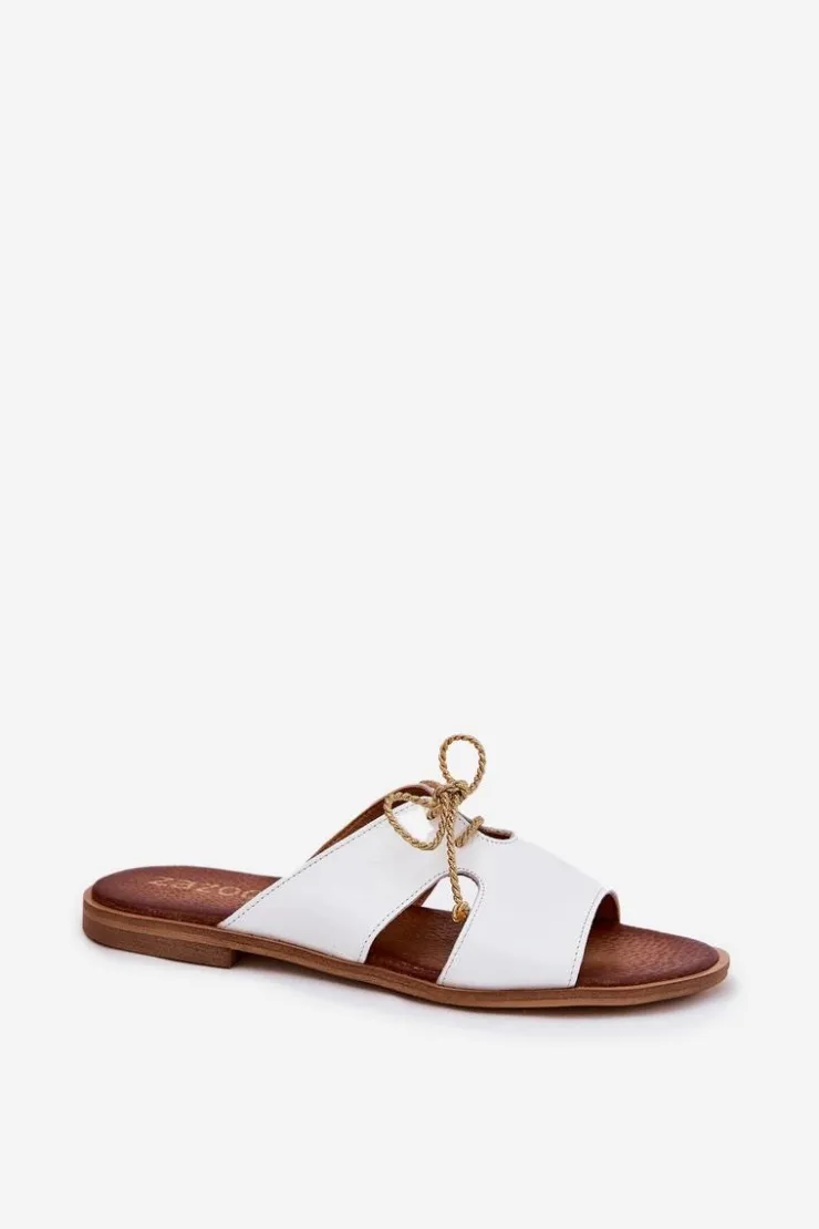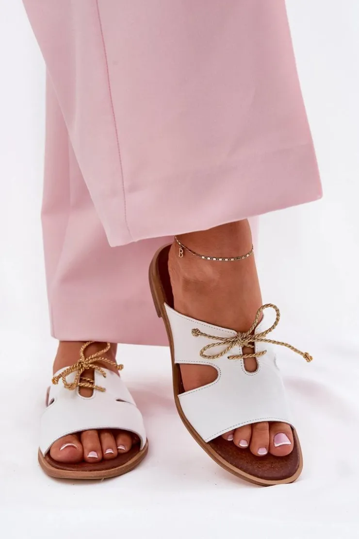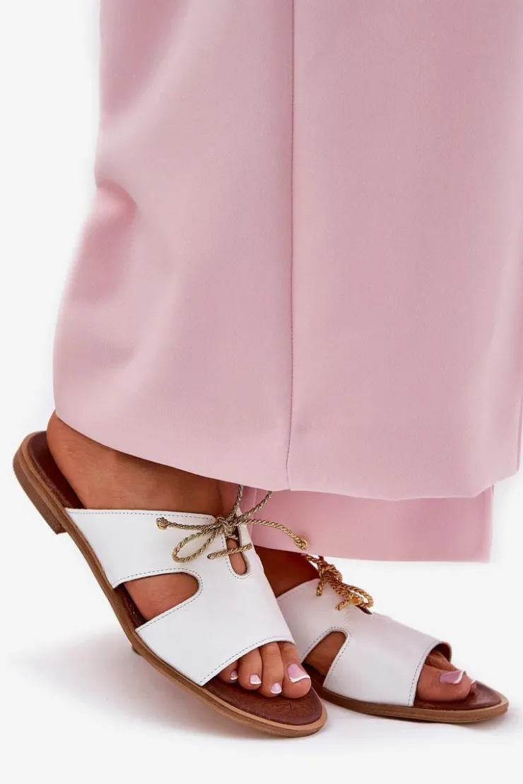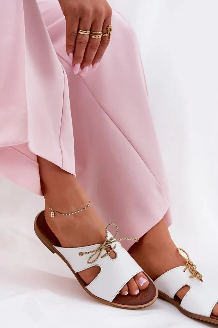 Damskie klapki z naturalnej skóry to świetny wybór na słoneczne dni, łączący elegancję z wygodą. Płaski obcas zapewnia komfort, a szykowny złoty sznureczek na cholewce dodaje im wyjątkowego uroku. Doskonałe do różnych letnich stylizacji, te klapki będą doskonałym dopełnieniem Twojego looku! Przy wyborze rozmiaru prosimy sugerować się tabelą rozmiarów.