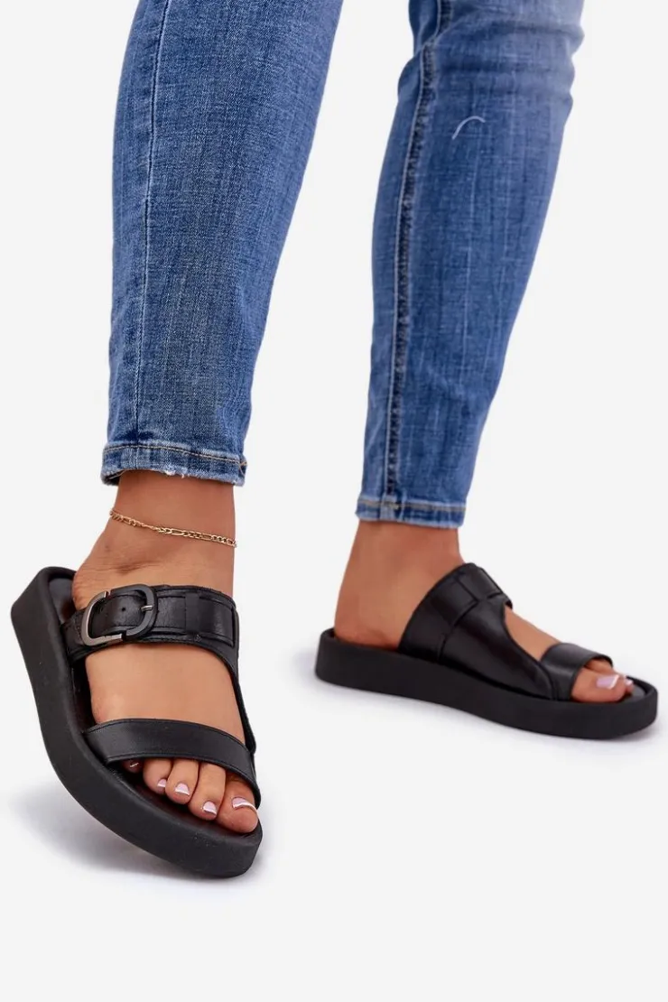 Damskie klapki wykonane z naturalnej skóry. Osadzone na platformie. Doskonałe na letnie dni, te klapki znakomicie uzupełnią każdą stylizację, łącząc modny wygląd z praktycznością. Pasek z klamrą zapewnia dodatkową regulację, a miękka wkładka skórzana gwarantuje komfort noszenia. Przy wyborze rozmiaru prosimy sugerować się tabelą rozmiarów.