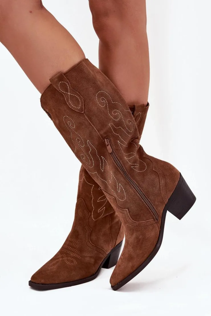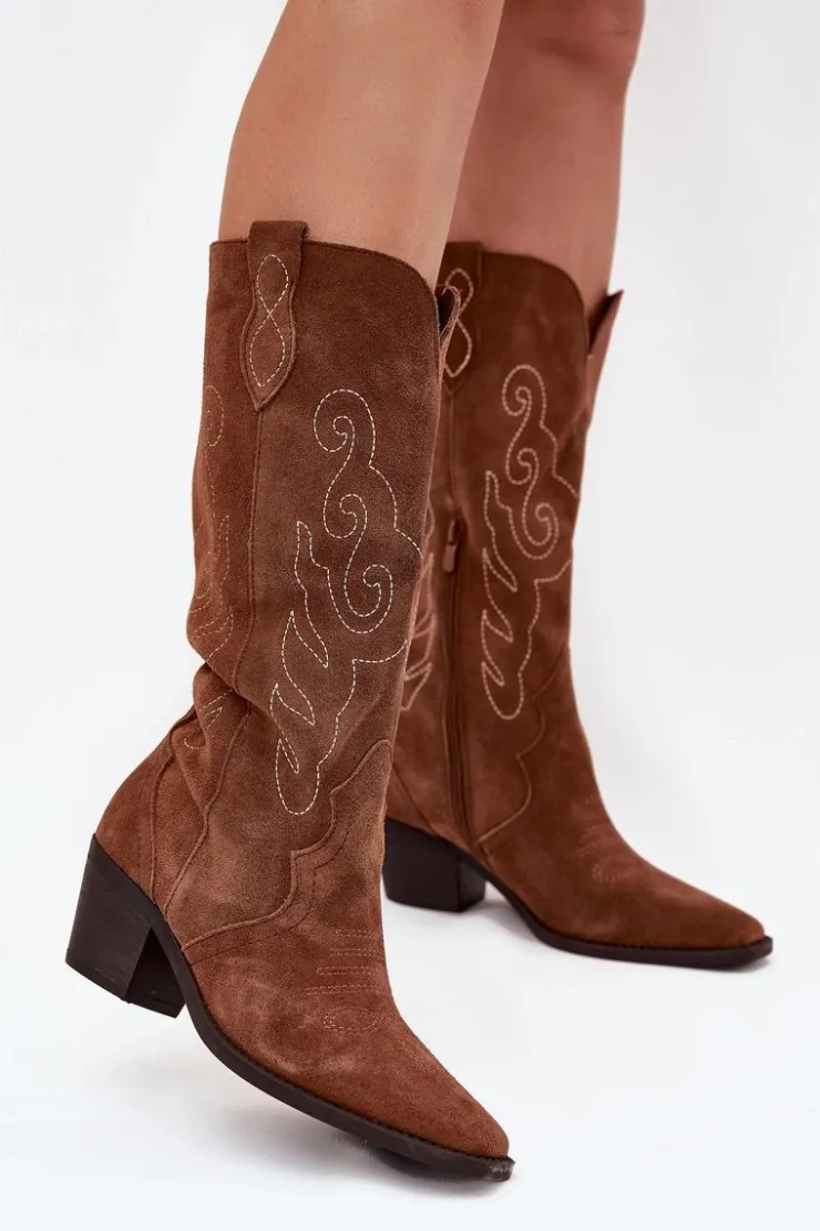 Clearance Zazoo Zamszowe Kozaki Kowbojki Damskie Na Obcasie Camel Karira Brązowy