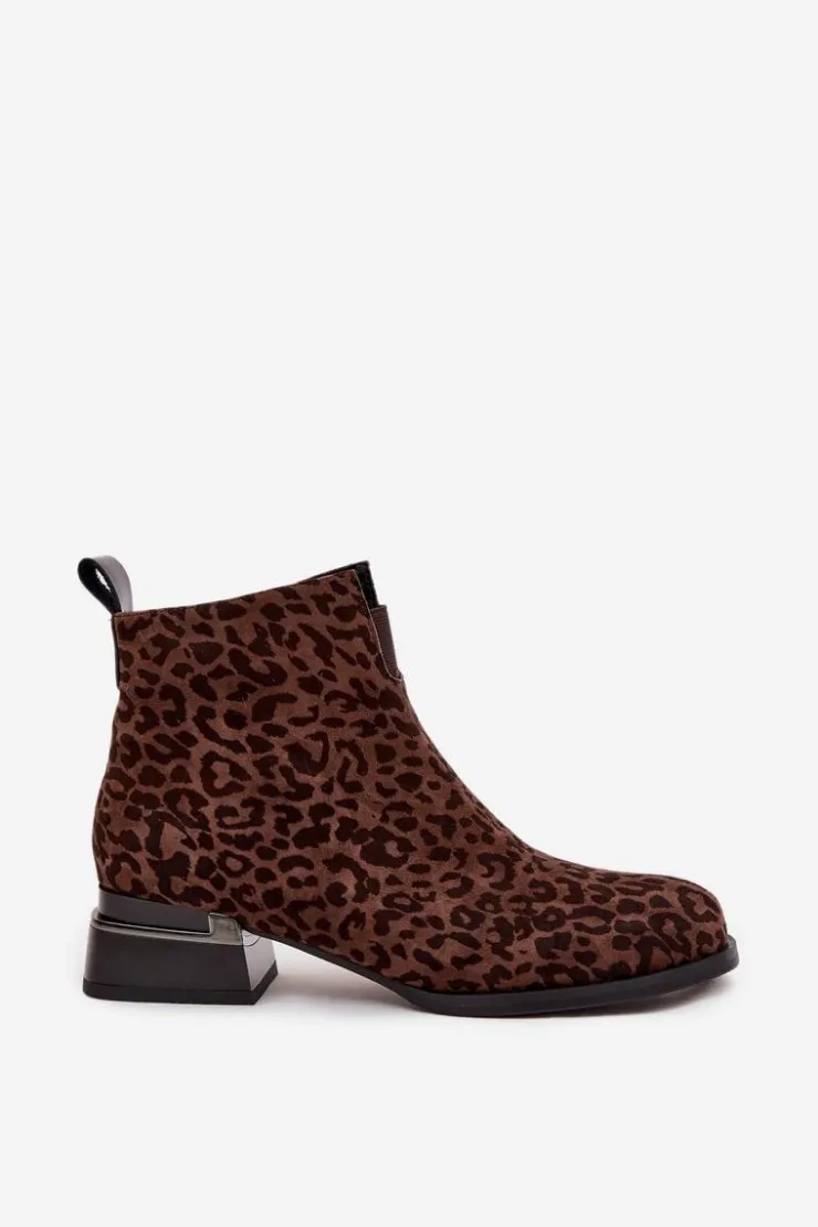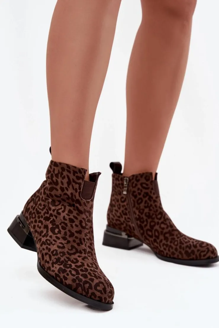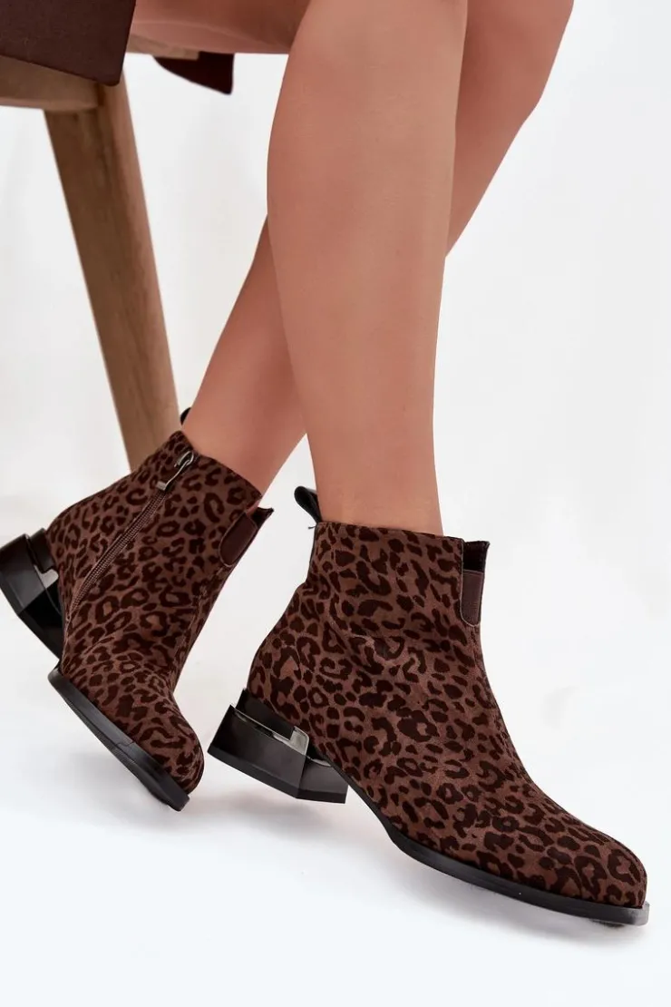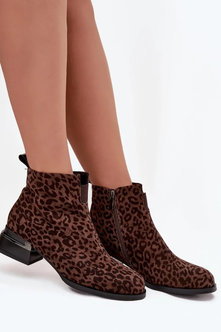 Botki damskie wykonane z naturalnego zamszu to połączenie elegancji i modowego charakteru. Model zachwyca stylowym panterkowym printem, który dodaje całości wyrazistości i kobiecego pazura. Osadzony na stabilnym obcasie typu klocek, zapewnia wygodę i pewność kroku. Wnętrze butów delikatnie ocieplane kocem obuwniczym gwarantuje komfort w chłodniejsze dni. Zaokrąglone noski i dekoracyjne przeszycie biegnące wzdłuż cholewki nadają im eleganckiego wykończenia. Botki zapinane są na zamek, co ułatwia zakładanie. To idealny model dla kobiet, które lubią łączyć klasykę z odrobiną drapieżnego stylu – świetny wybór zarówno do codziennych, jak i bardziej stylowych zestawów. Przy wyborze rozmiaru prosimy sugerować się tabelą rozmiarów.