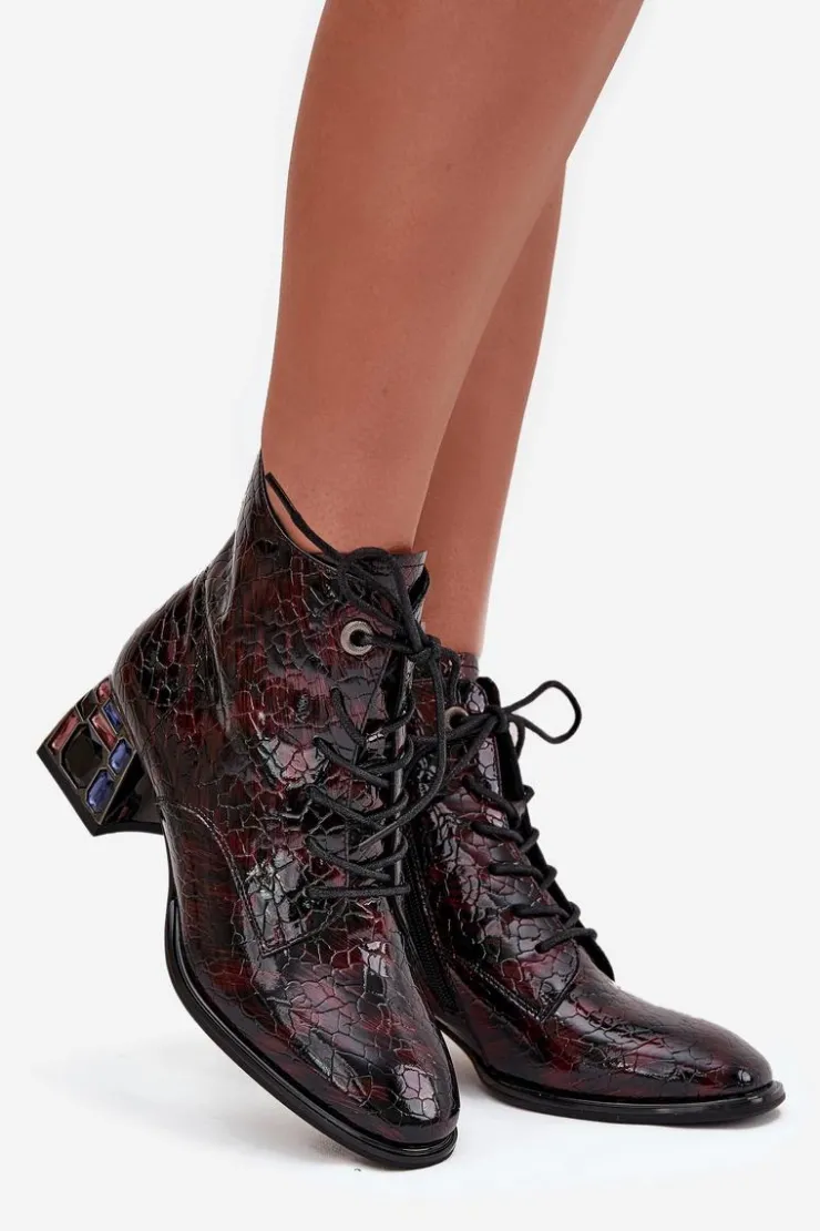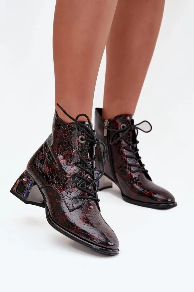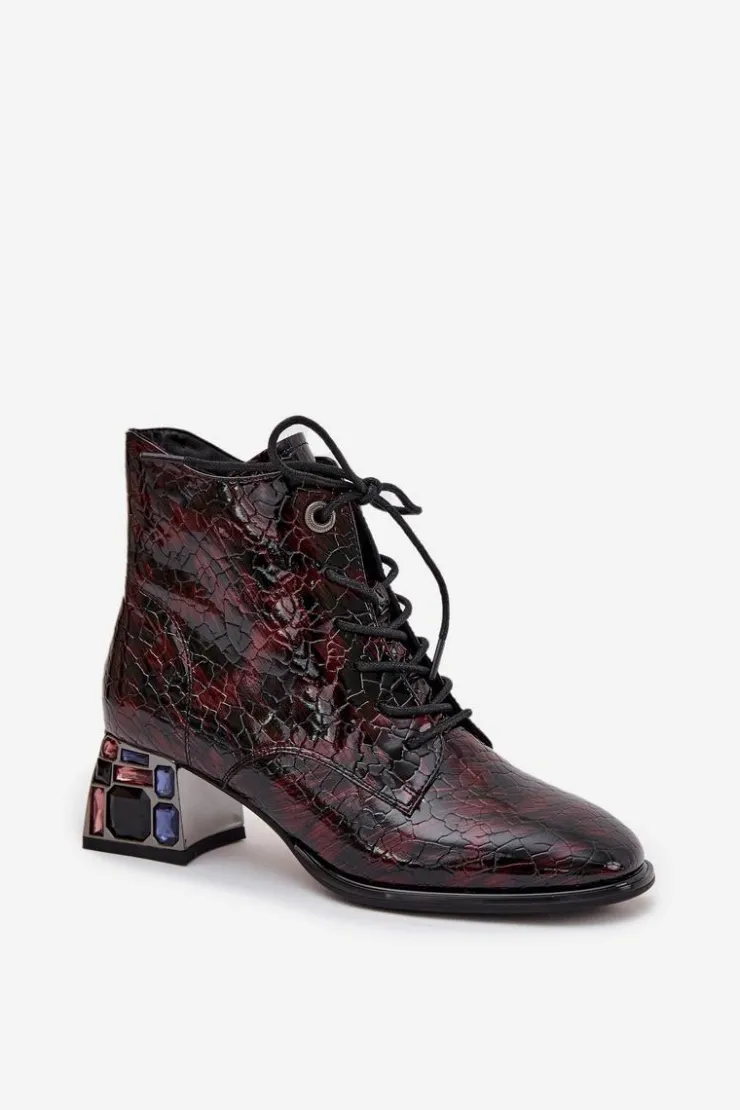 Botki damskie marki Artiker wykonane z lakierowanej skóry naturalnej to eleganckie obuwie z nutą oryginalności. Osadzone na stabilnym obcasie typu klocek, ozdobionym kryształkami, przyciągają uwagę i dodają stylizacjom wyjątkowego charakteru. Model łączy sznurowanie z praktycznym zamkiem, co ułatwia zakładanie i dopasowanie do stopy. Zaokrąglone noski podkreślają klasyczny fason, a wnętrze ocieplone miękkim w dotyku kocem obuwniczym zapewnia komfort i ciepło w chłodniejsze dni. Przy wyborze rozmiaru prosimy sugerować się tabelą rozmiarów.