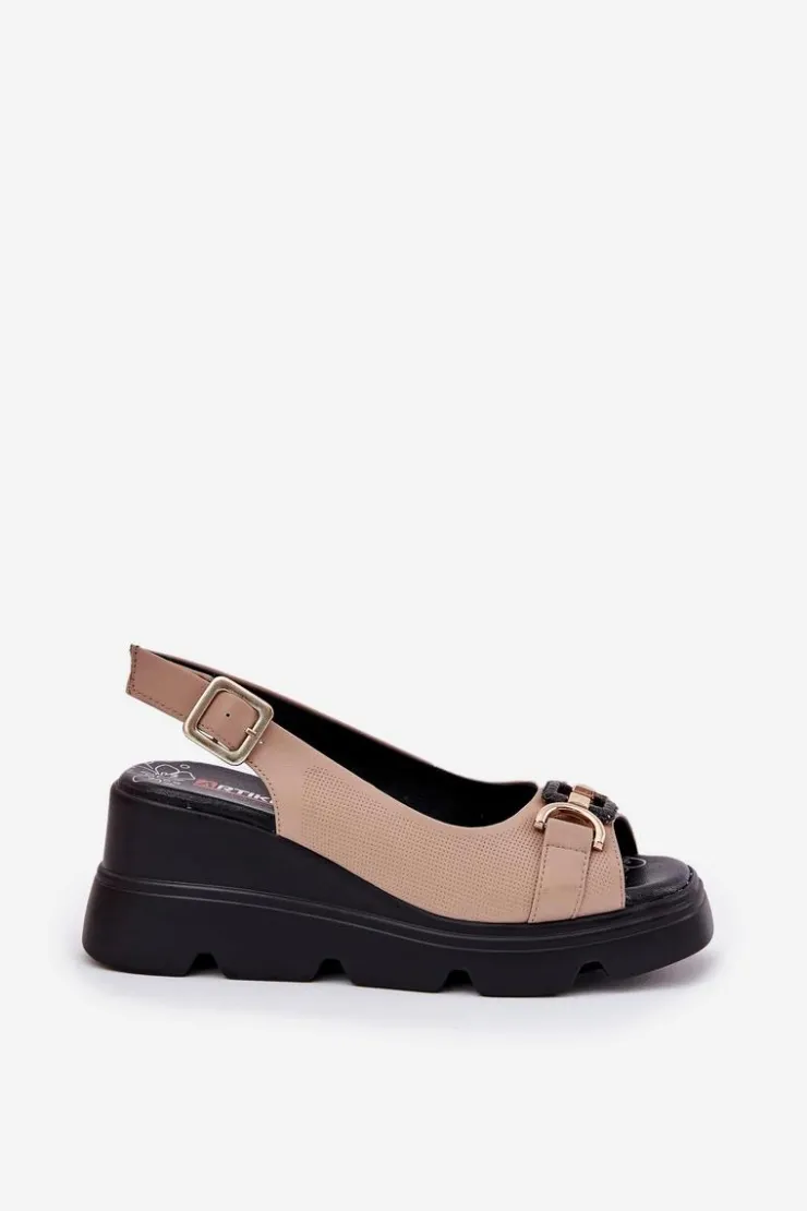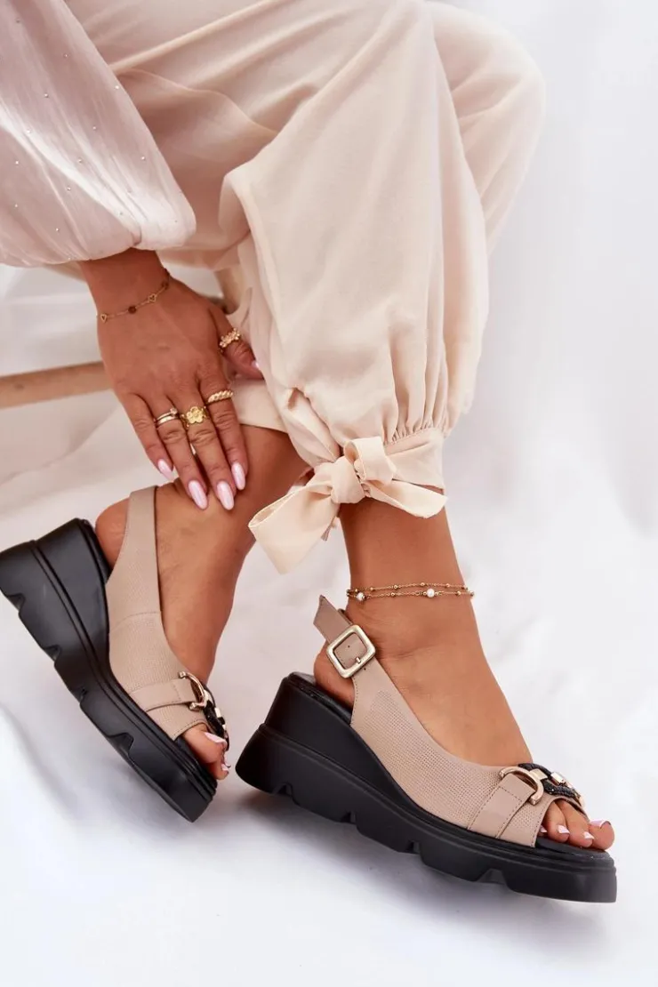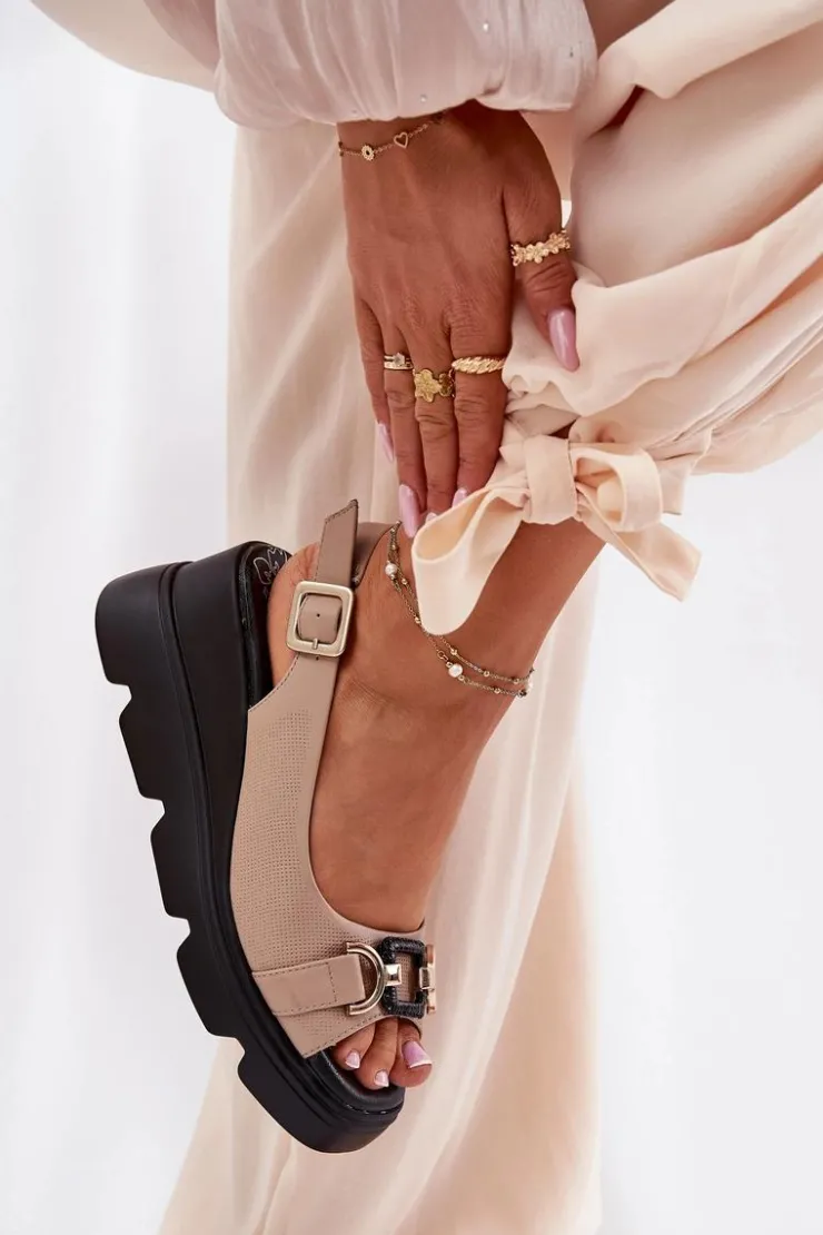 Damskie sandały wykonane z wysokiej jakości naturalnej skóry to połączenie elegancji i komfortu. Osadzone na platformie i koturnie, zapewniają wygodę oraz stabilność przez cały dzień. Z przodu znajduje się subtelny ozdobny detal, który dodaje im wyjątkowego charakteru. Miękka wkładka gwarantuje komfort noszenia, a zapinanie na klamrę z regulowanym paskiem umożliwia idealne dopasowanie do stopy. Te sandały to doskonały wybór do letnich stylizacji, idealne na różne okazje. Przy wyborze rozmiaru prosimy sugerować się tabelą rozmiarów.