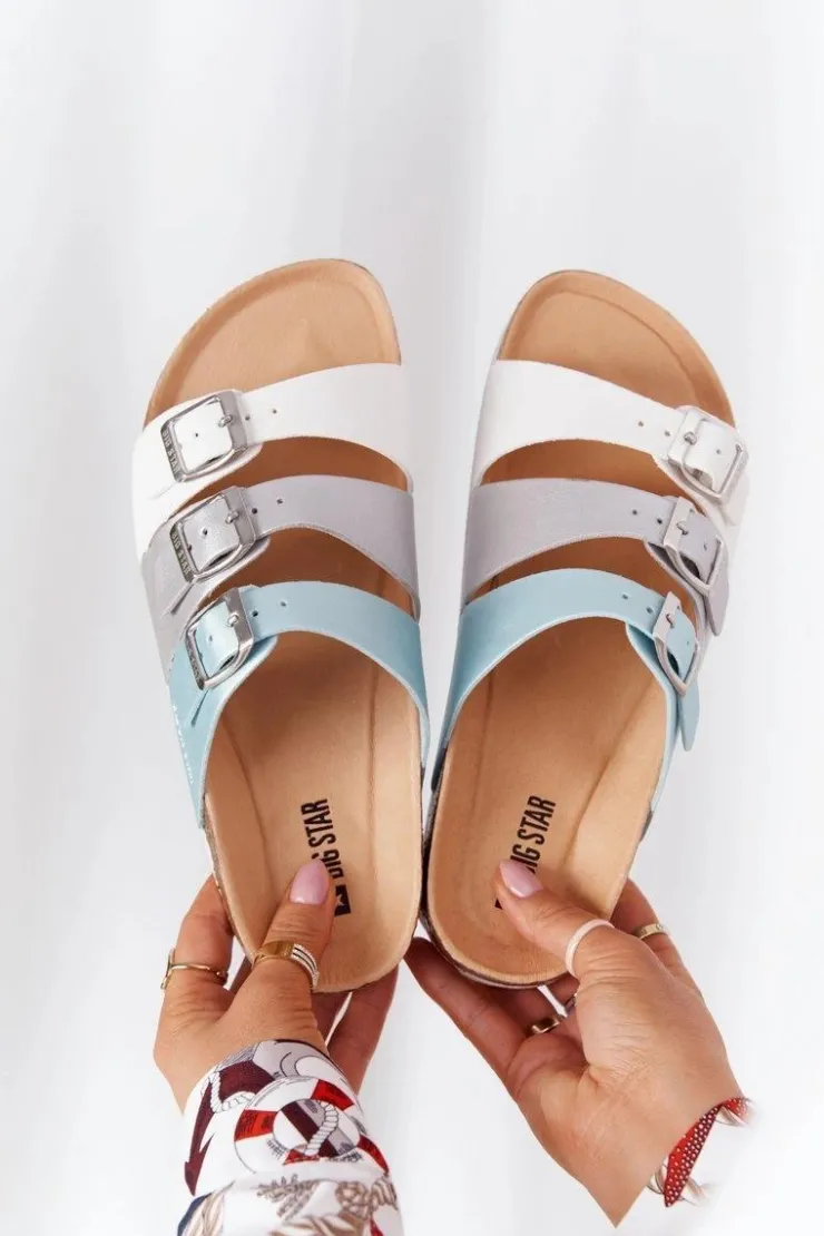 Klapki na korkowej podeszwie od polskiej marki BIG STAR. Buty posiadają profilowaną wkładkę ze skóry naturalnej, która zagwarantuje komfort. Modny fason z klamrami zapewni dopasowanie do stopy. Przy wyborze rozmiaru prosimy sugerować się tabelą rozmiarów.