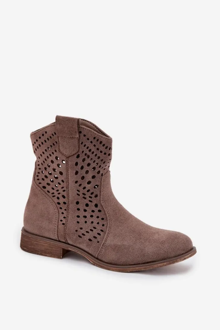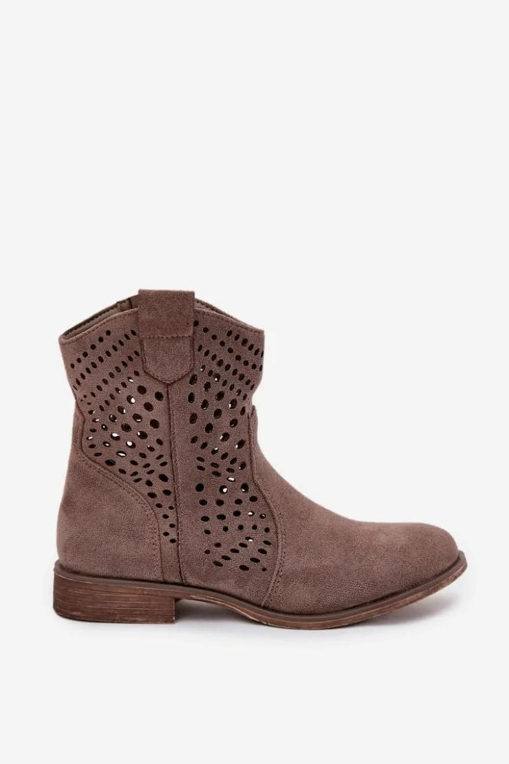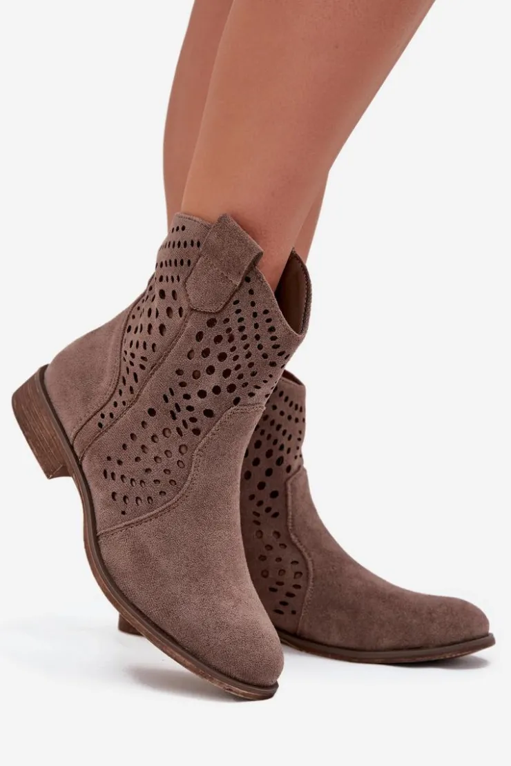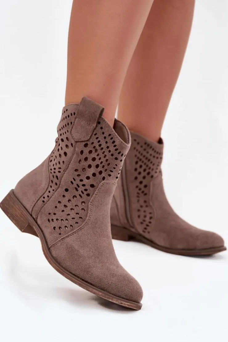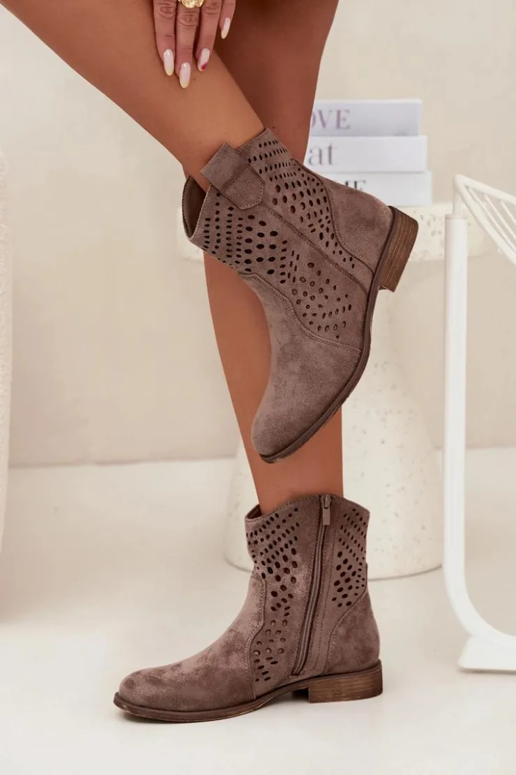 Damskie botki z eko zamszu to elegancka i wygodna propozycja na chłodniejsze dni. Wykonane z eko zamszu, charakteryzują się subtelnym, ażurowym wzorem, który dodaje im lekkości i modnego charakteru. Płaski obcas zapewnia komfort noszenia przez cały dzień, a zamek ułatwia zakładanie i zdejmowanie. Botki są ocieplane na wysokości stopy, co gwarantuje ciepło w zimniejsze dni. Idealne do codziennych stylizacji. Przy wyborze rozmiaru prosimy sugerować się tabelą rozmiarów.
