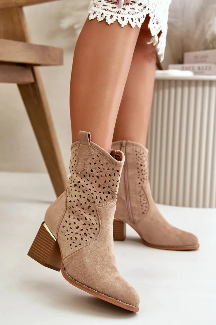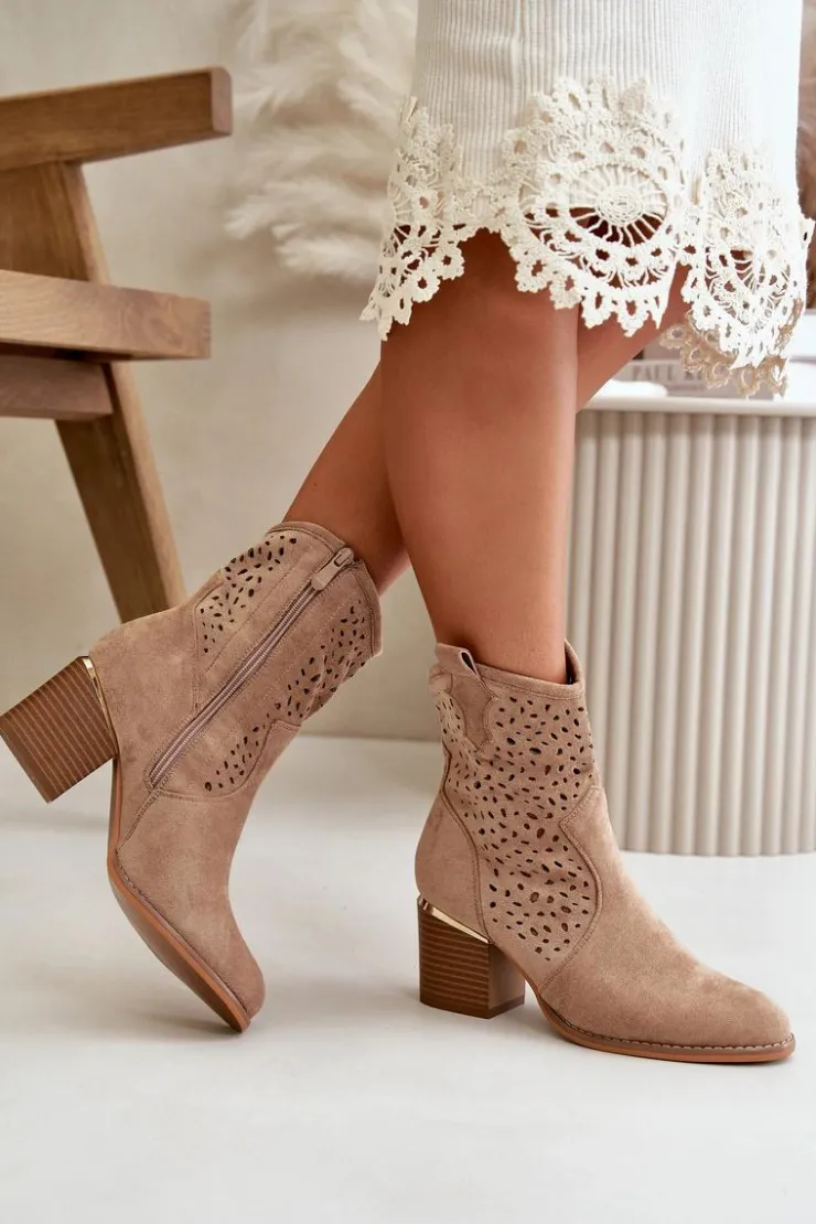 Damskie botki wykonane z eko zamszu, wyróżniają się ażurową cholewką, która sięga za kostkę. Osadzone na eleganckim słupkowym obcasie, ozdobionym złotym elementem, co dodaje im wyjątkowego charakteru. Zapinane na zamek, zapewniają wygodę użytkowania. Noski zaokrąglone, co podkreśla ich klasyczny i stylowy wygląd. Idealne do codziennych i eleganckich stylizacji. Przy wyborze rozmiaru prosimy sugerować się tabelą rozmiarów.