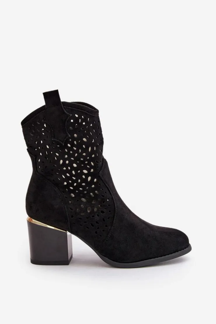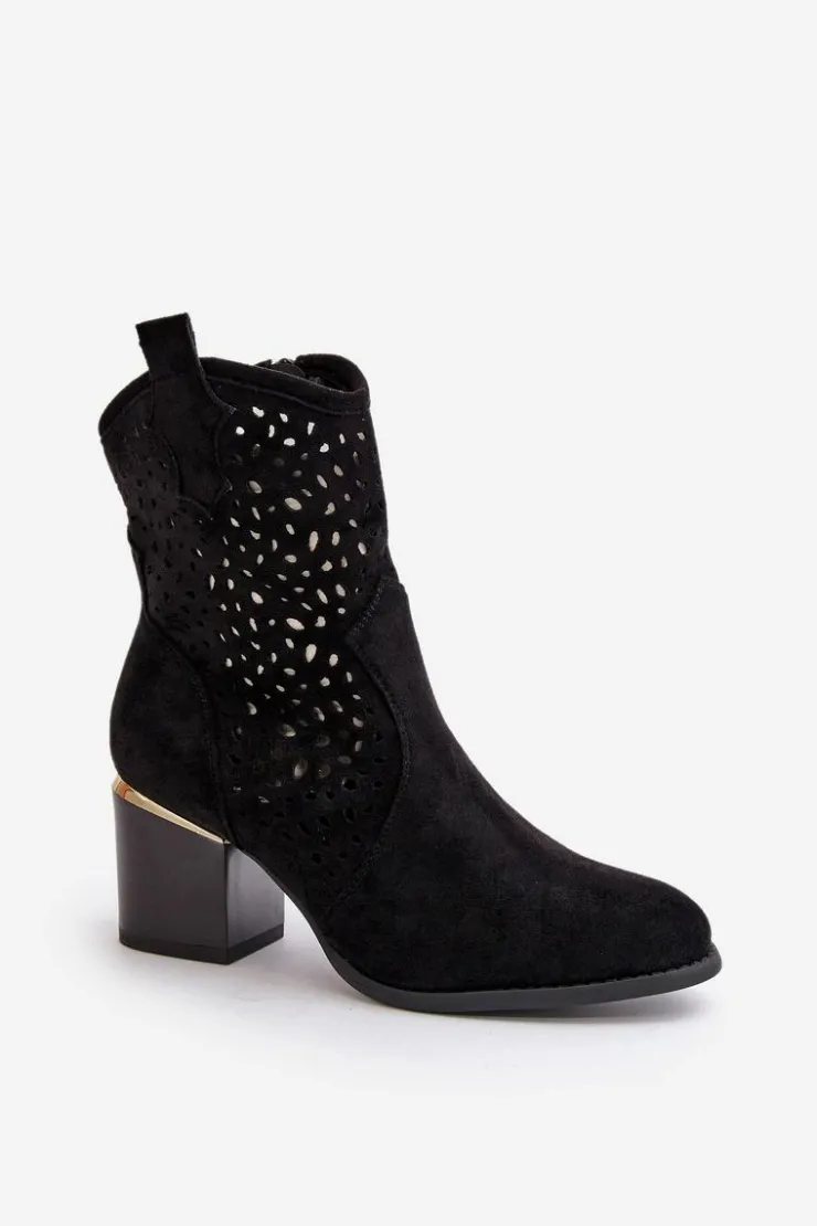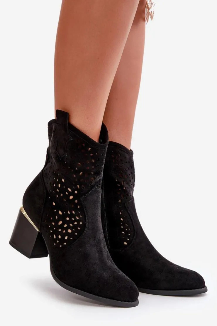 Damskie botki wykonane z eko zamszu, wyróżniają się ażurową cholewką, która sięga za kostkę. Osadzone na eleganckim słupkowym obcasie, ozdobionym złotym elementem, co dodaje im wyjątkowego charakteru. Zapinane na zamek, zapewniają wygodę użytkowania. Noski zaokrąglone, co podkreśla ich klasyczny i stylowy wygląd. Idealne do codziennych i eleganckich stylizacji. Przy wyborze rozmiaru prosimy sugerować się tabelą rozmiarów.