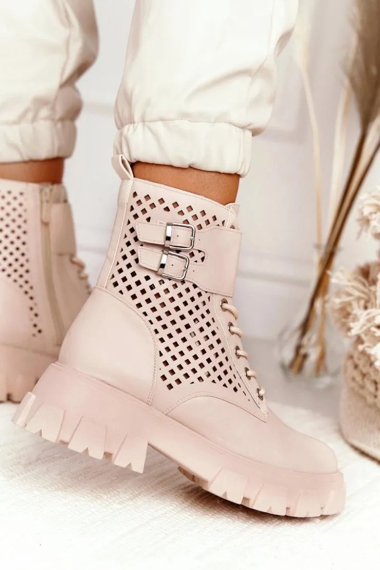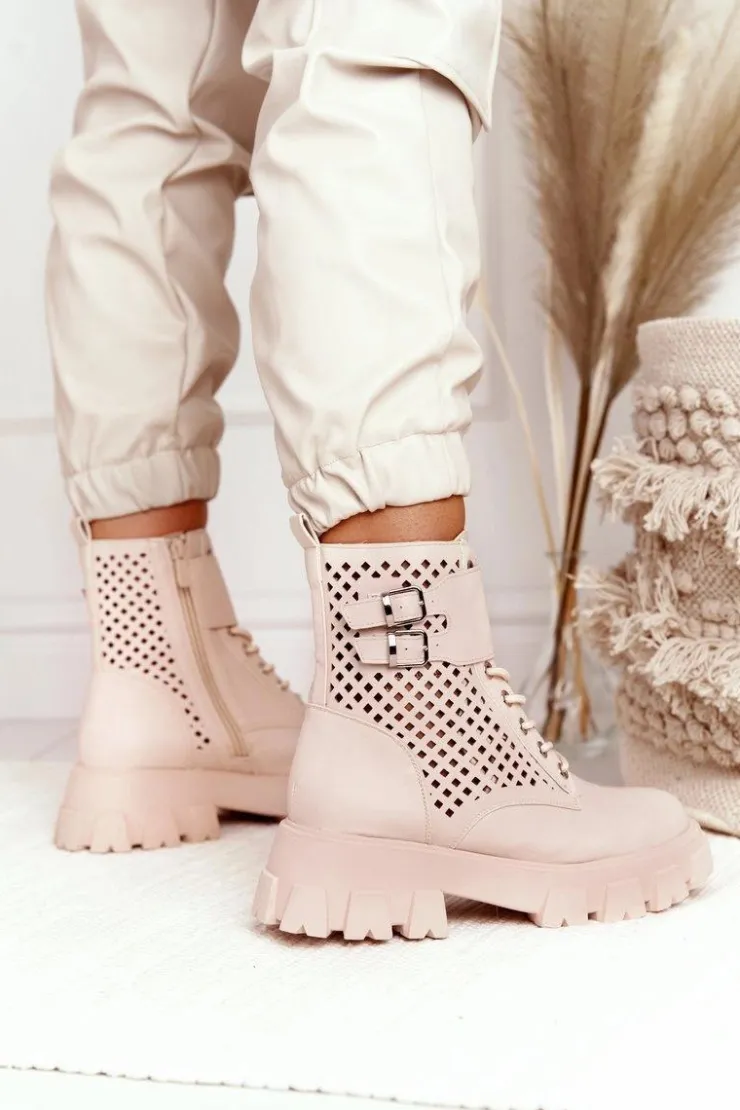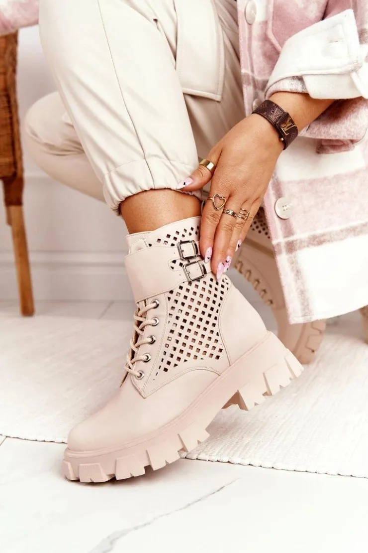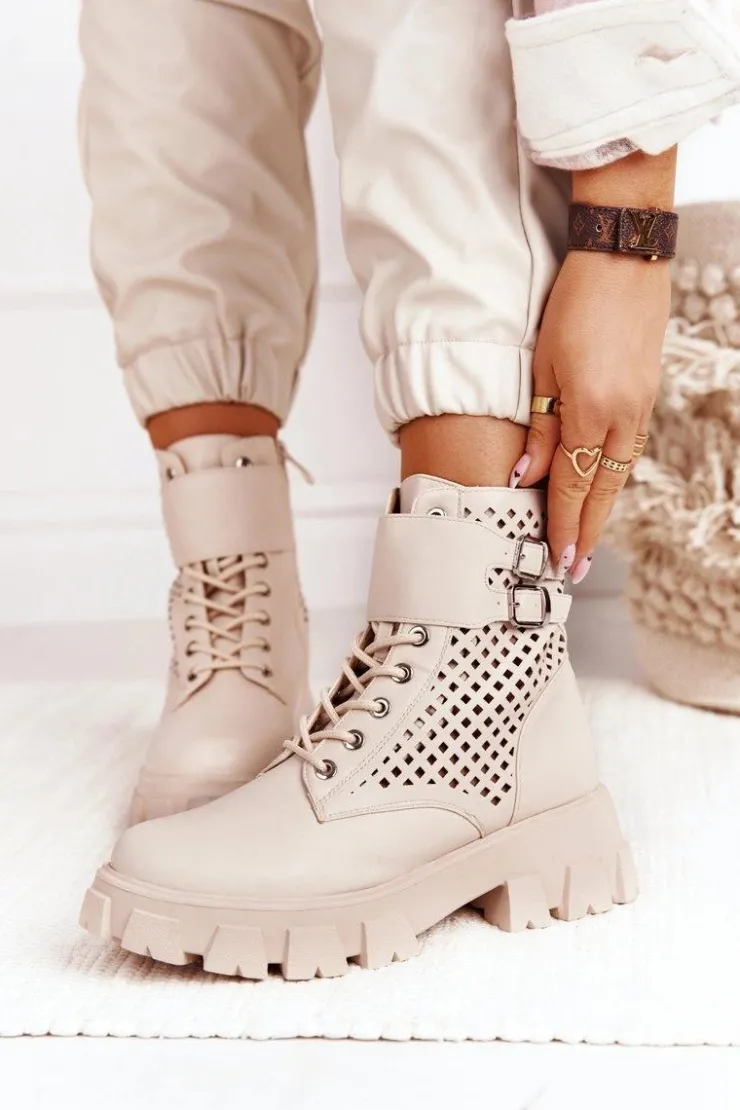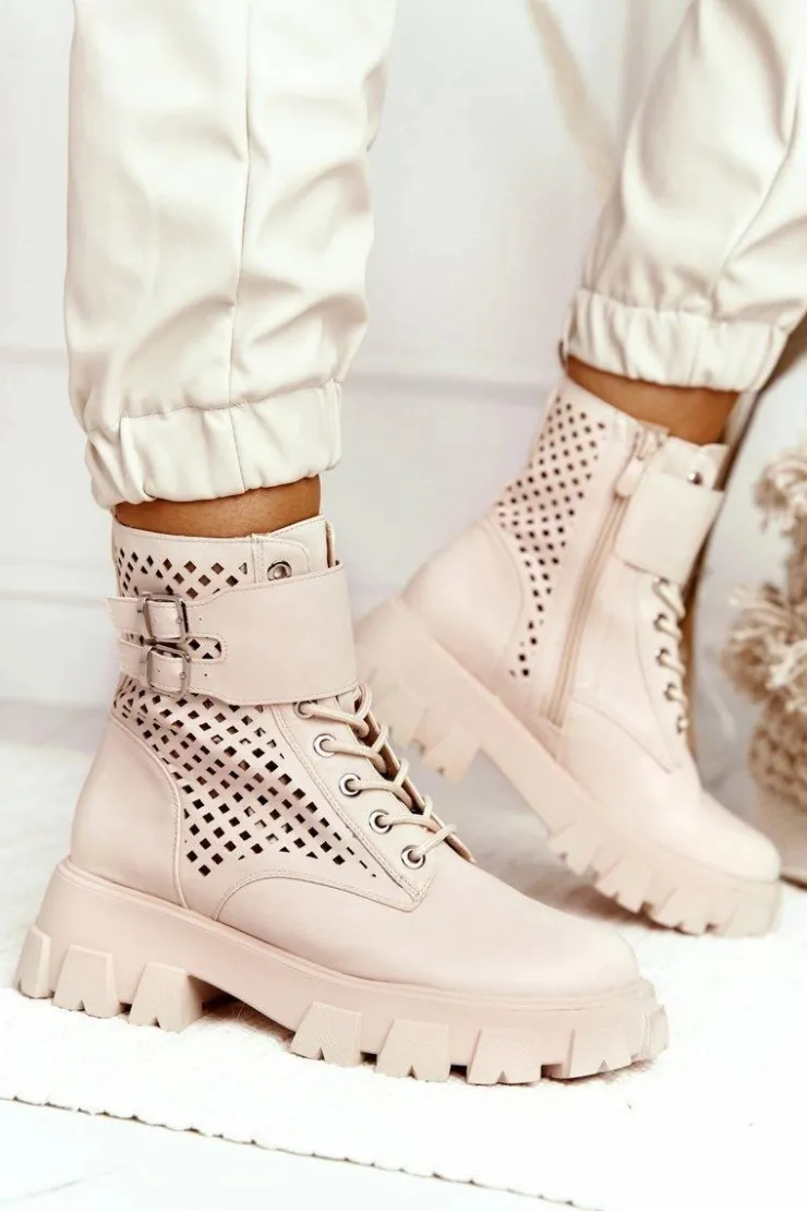 Damskie Boto Ażurowe Botki Workery Na Platformie Beżowe Blown Away
