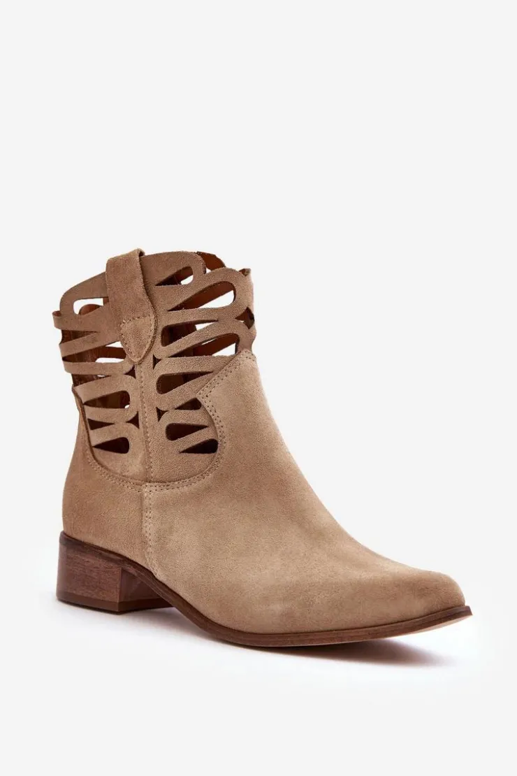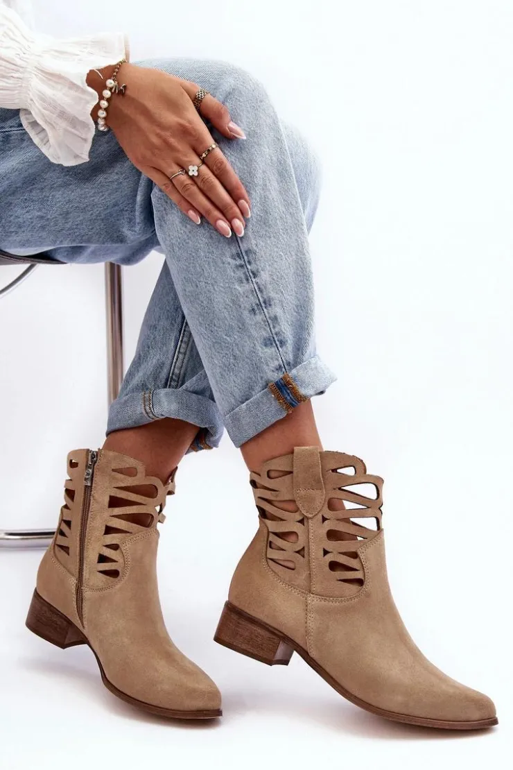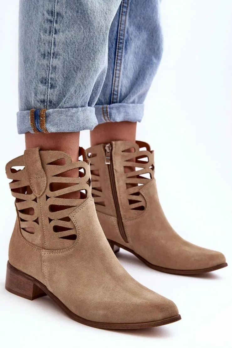 Damskie botki zostały wykonane z wysokiej jakości skóry naturalnej. Zapinane na suwak z boku. Osadzone na płaskim obcasie, co sprawia, że są niezwykle wygodne i stabilne. Noski w szpic optycznie wysmuklą nogi. Dodatkowo zapiętek jest usztywniony. Model ten posiada miękką wkładkę wykonaną z naturalnej skóry. Przy wyborze rozmiaru prosimy sugerować się tabelą rozmiarów.