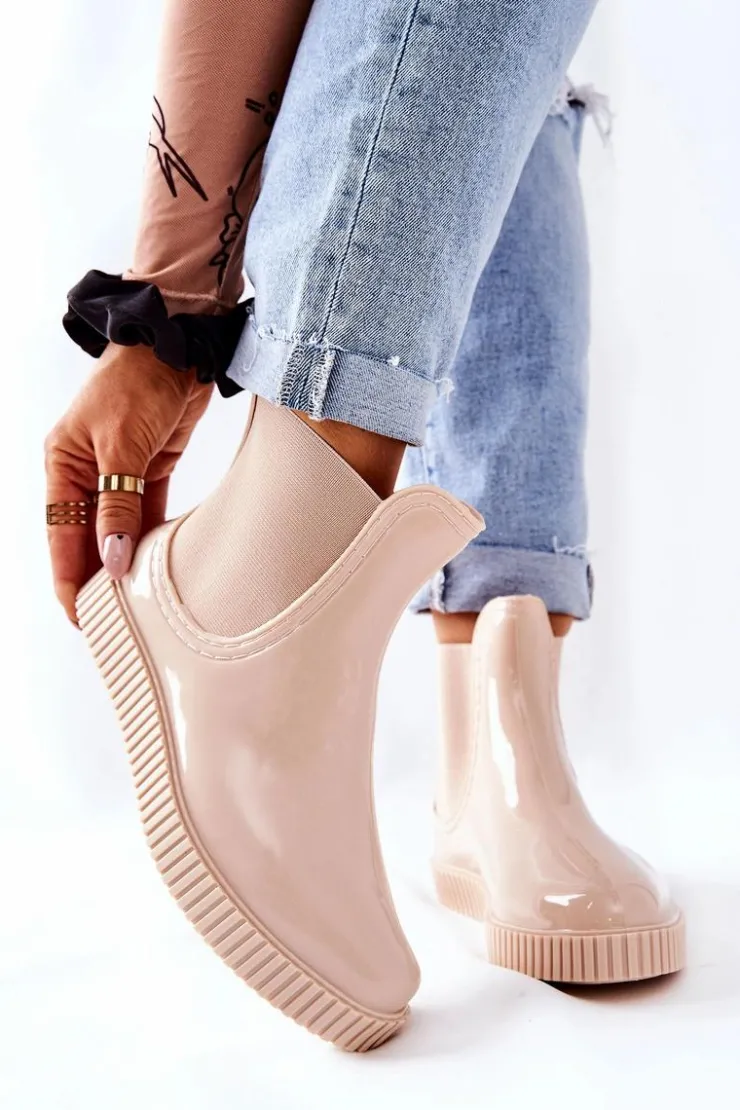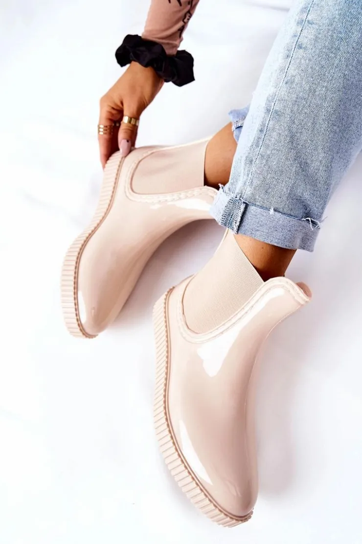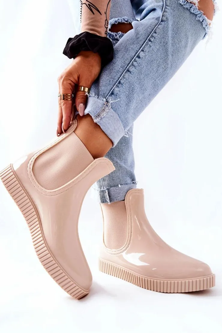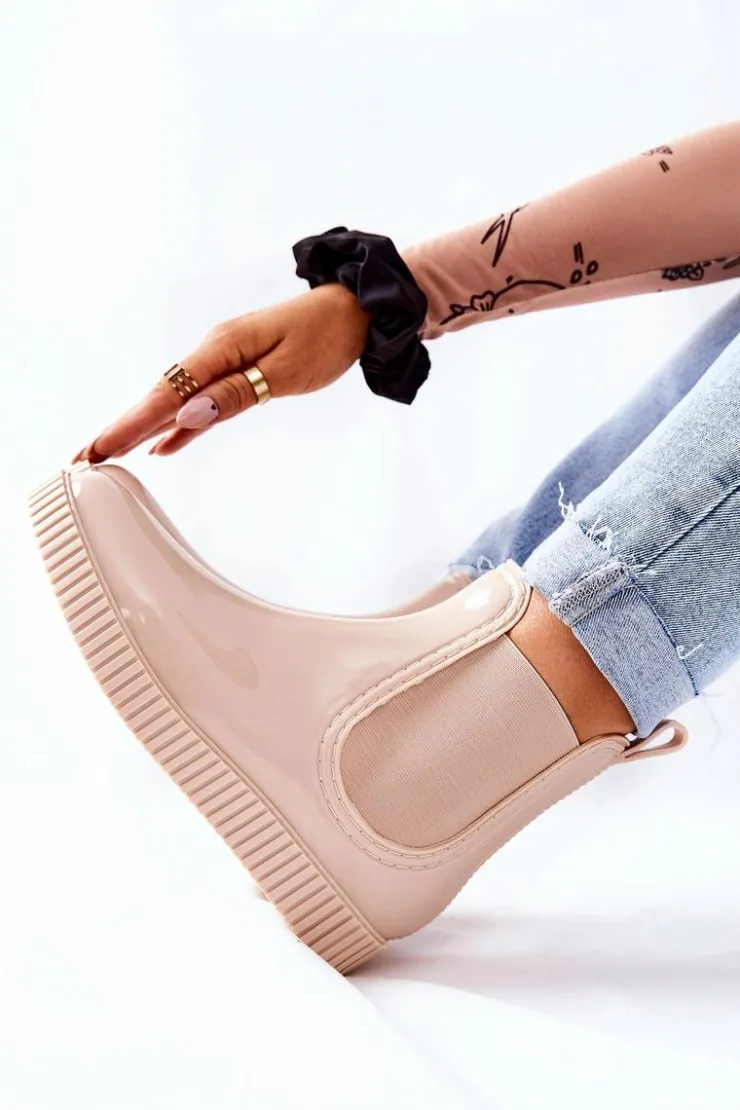Damskie Boto Błyszczące Kalosze Na Platformie Beżowe Waterfall