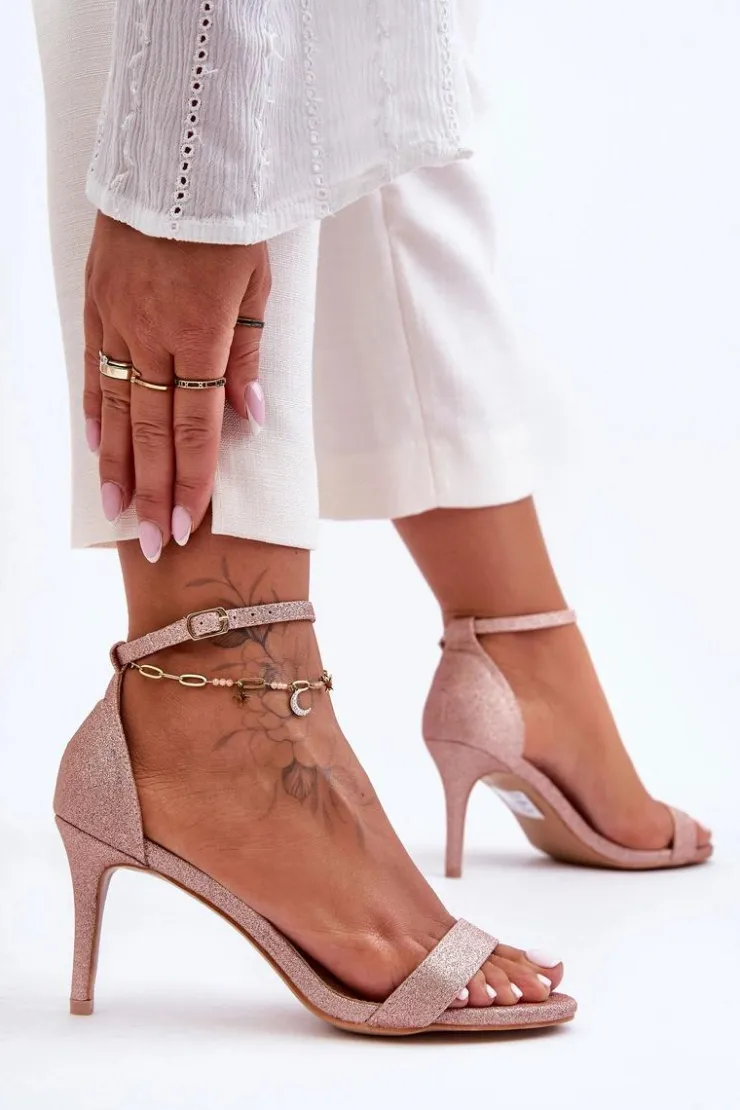 Klasyczne, brokatowe sandały zostały osadzone na obcasie w postaci szpilki. Model ten posiada usztywniany zapiętek oraz zapięcie na cienki pasek ze sprzączką. Wysoki obcas i miękka, eko skórzana wkładka zapewni dobre samopoczucie oraz gustowny wygląd. Przy wyborze rozmiaru prosimy sugerować się tabelą rozmiarów.