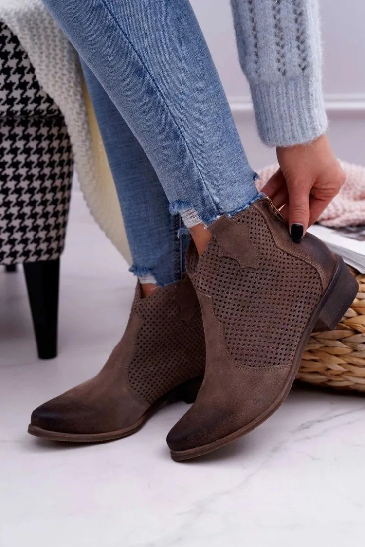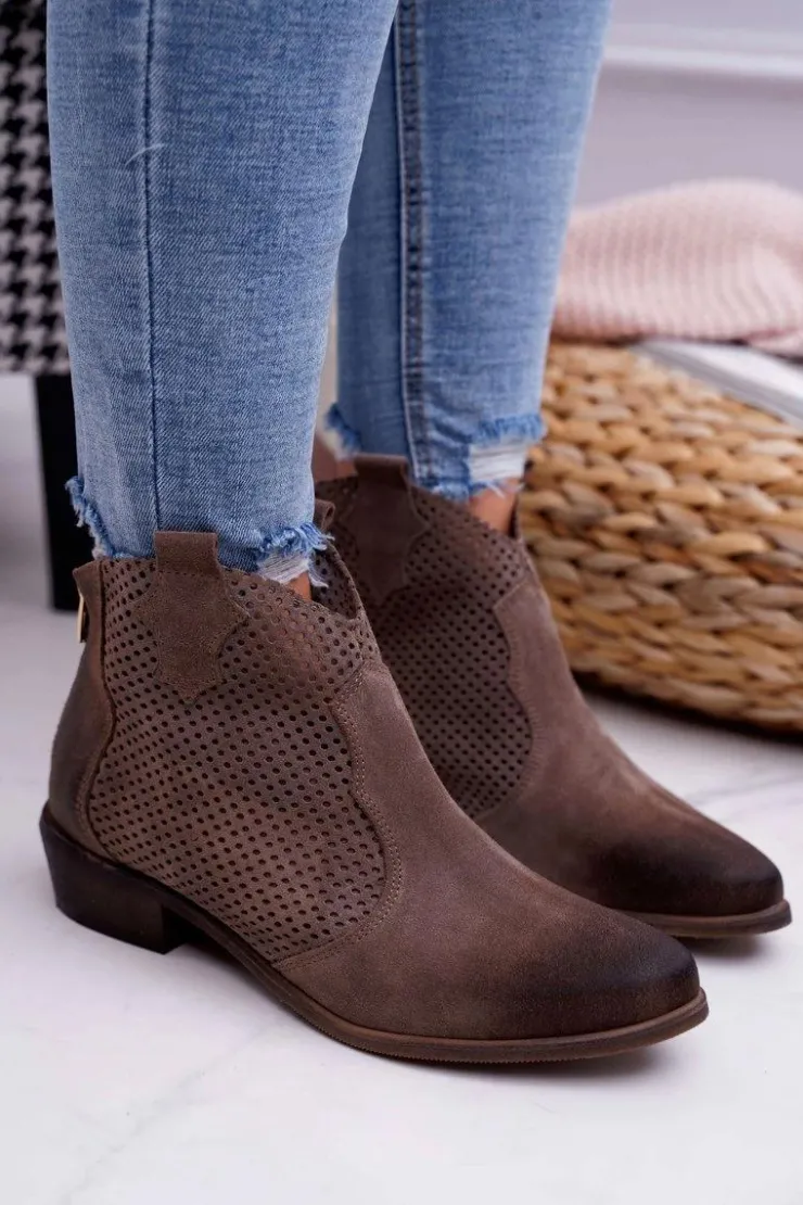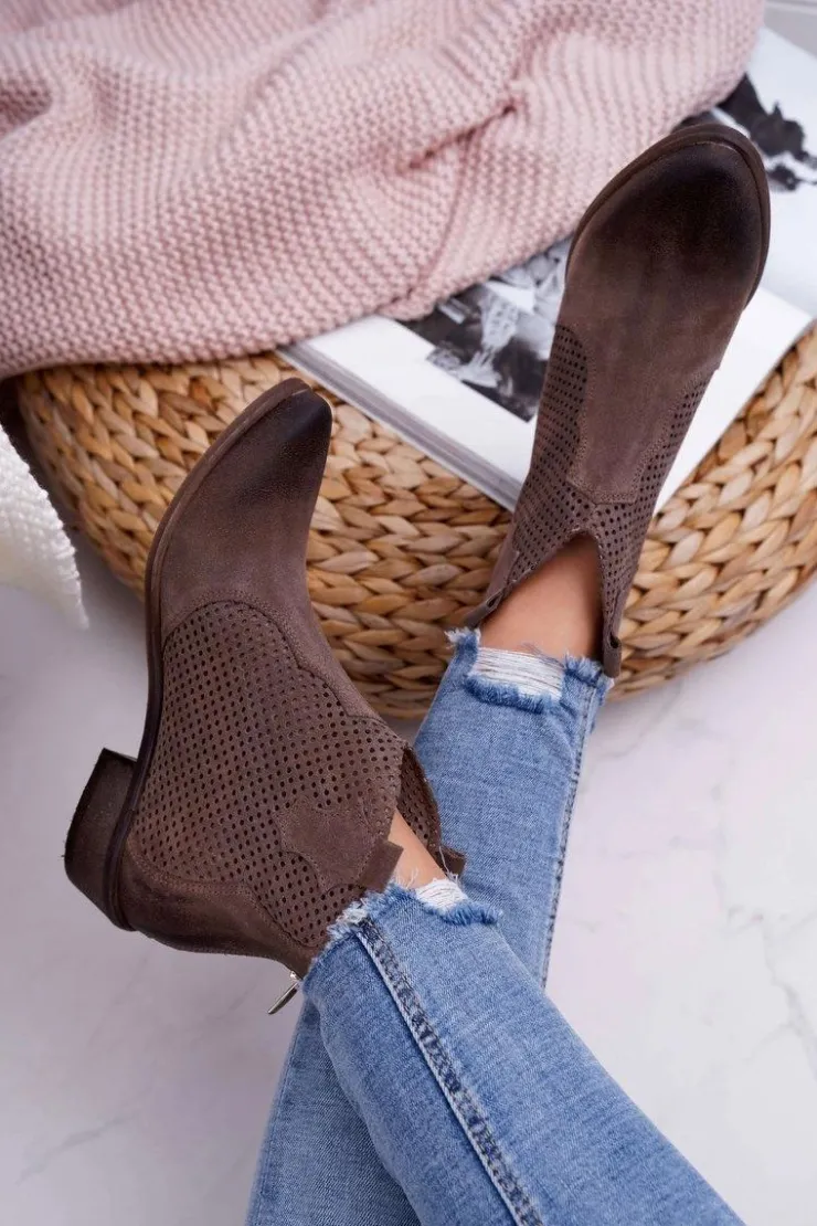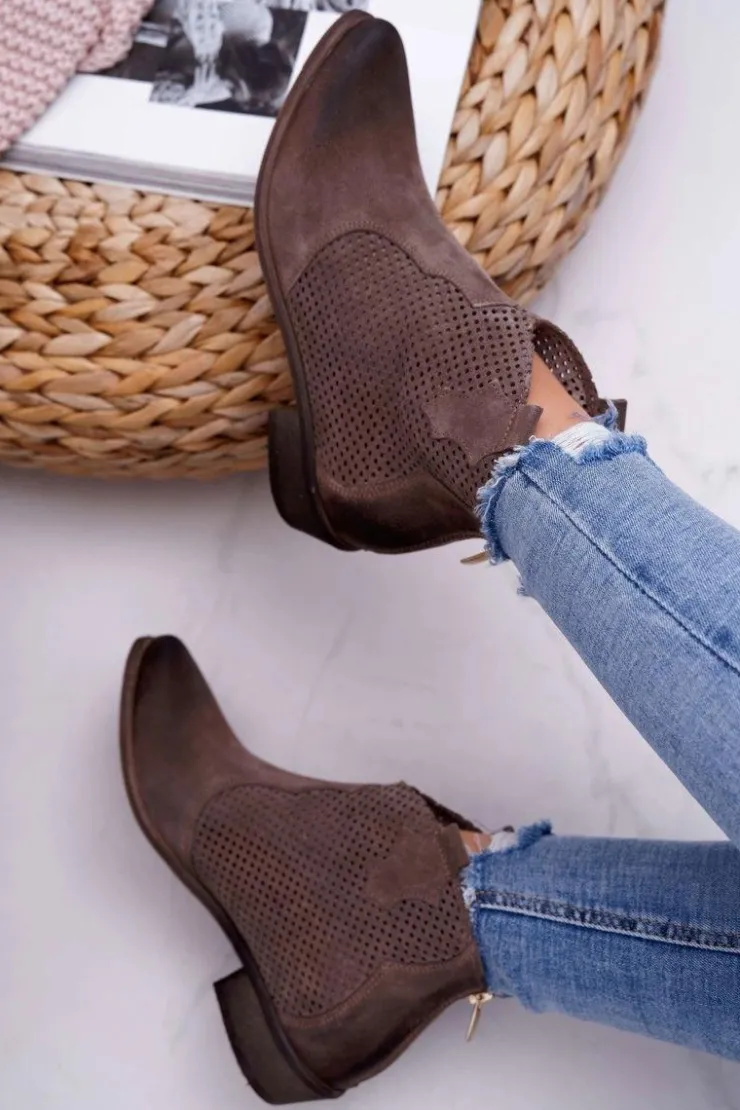 Botki to nie tylko buty na chłodne dni. Świetnie sprawdzą się również podczas tworzenia wiosennych stylizacji. Ażurowy design oraz zapinanie na zamek z tyłu cholewki. Botki w całości wykonane z naturalnej skóry. Produkt Polski firmy Exquisite co gwarantuje nam komfort oraz wysoką jakość wykonania. Idealne do zwiewnych sukienek oraz jeansowych spodni. Przy wyborze rozmiaru prosimy sugerować się tabelą rozmiarów.