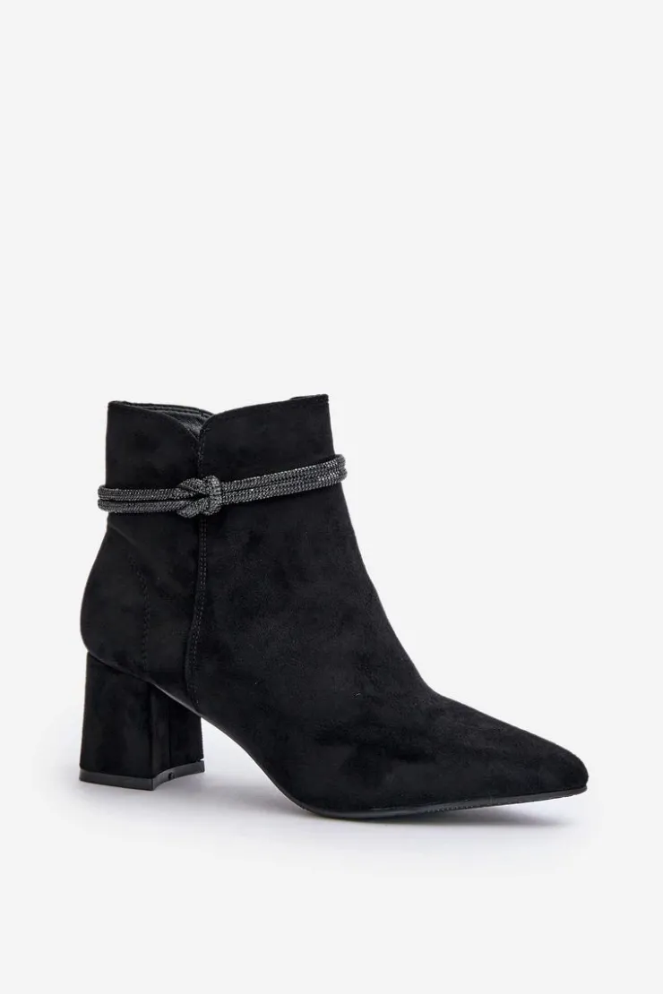 Botki damskie z cholewką sięgającą za kostkę. Wykonane z miłego w dotyku eko zamszu. Osadzone na obcasie w formie słupka. Cholewka ozdobiona błyszczącym paseczkiem. Noski w szpic optycznie wysmuklą nogi. Zapięcie na zamek gwarantuje łatwe zakładanie i zdejmowanie butów, co jest szczególnie praktyczne w codziennym użytkowaniu. Przy wyborze rozmiaru prosimy sugerować się tabelą rozmiarów.