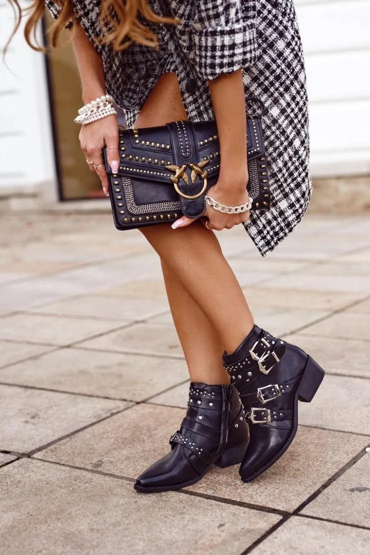 Już są! Botki w kowbojskim stylu zdobione srebrnymi klamrami. Fason z noskiem w szpic. Botki ocieplone są ciepłym i miłym w dotyku kocem obuwniczym. W takich butach zakocha się każdy, kto lubi mocniejsze akcenty w swoich stylizacjach. Przy wyborze rozmiaru prosimy sugerować się tabelą rozmiarów.