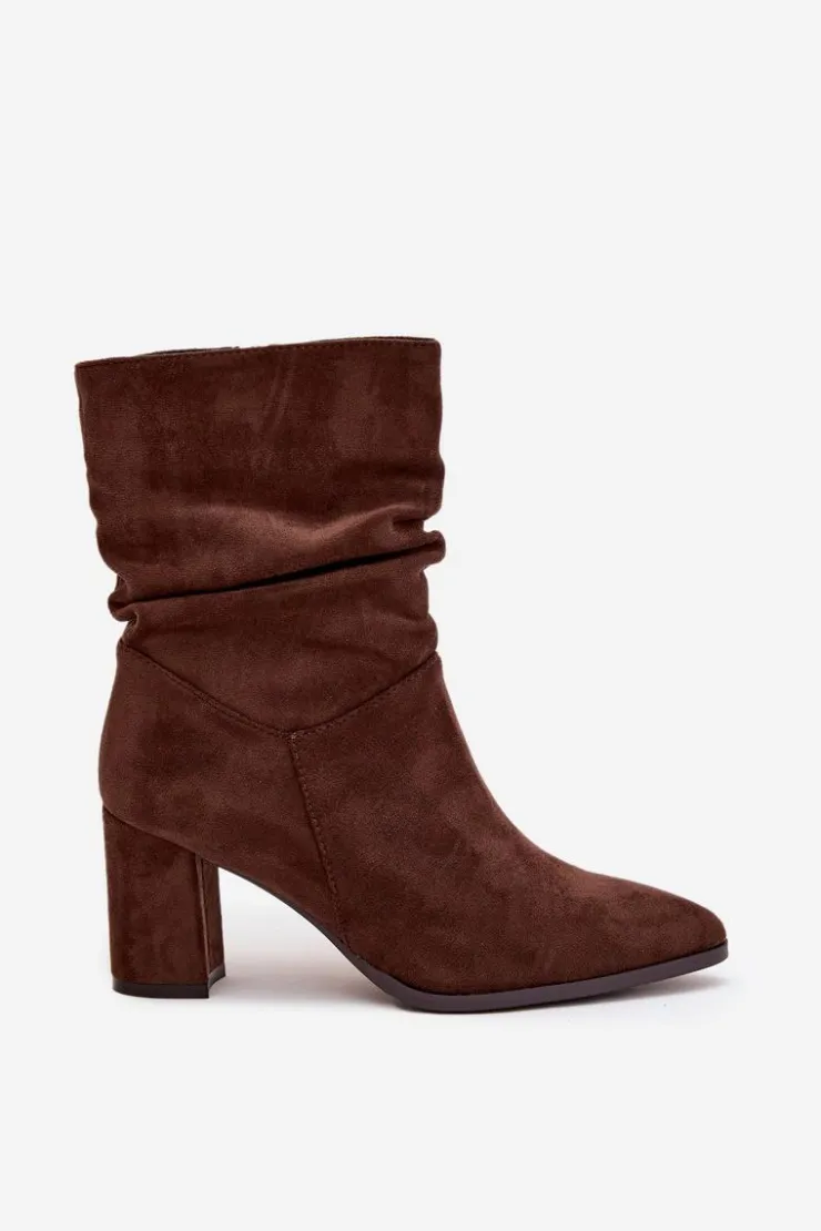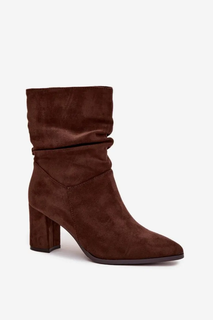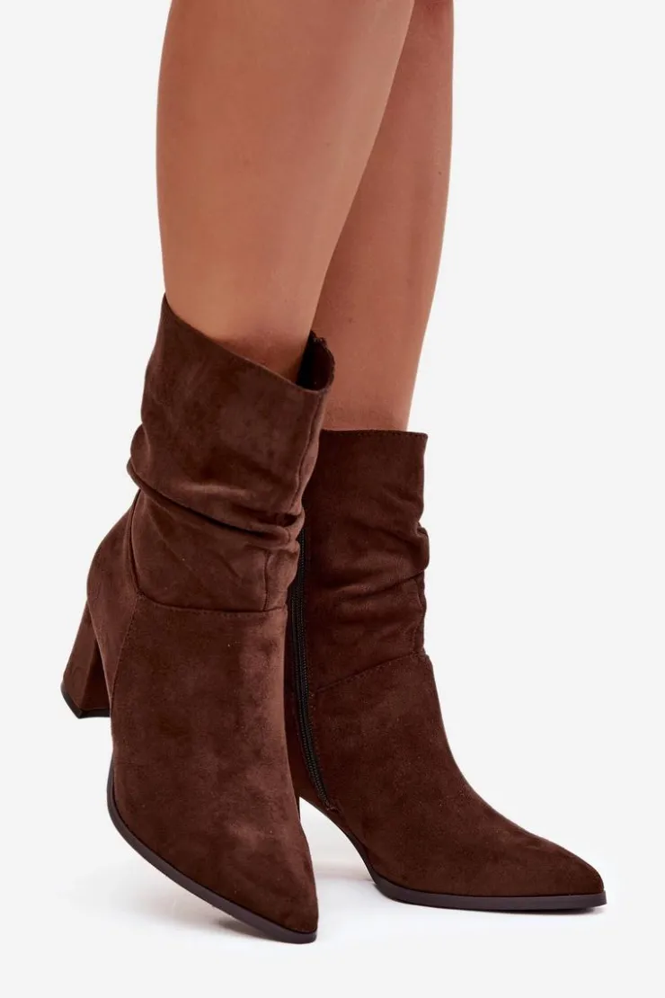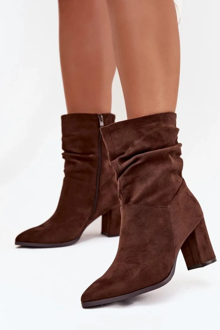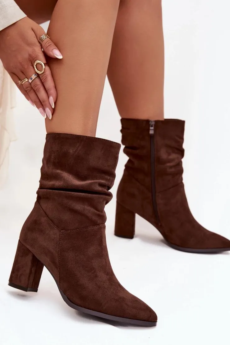 Botki damskie wykonane z eko zamszu to elegancka i modna propozycja na sezon jesienno-zimowy. Osadzone na stabilnym obcasie typu słupek pięknie wysmuklają sylwetkę, a szpiczaste noski dodają całości kobiecego charakteru. Marszczona cholewka nadaje stylowego, nowoczesnego wyglądu, a praktyczny zamek ułatwia zakładanie. Wnętrze ocieplone kocem obuwniczym zapewnia komfort i ciepło w chłodniejsze dni. To model, który doskonale sprawdzi się zarówno w codziennych, jak i eleganckich stylizacjach. Przy wyborze rozmiaru prosimy sugerować się tabelą rozmiarów.