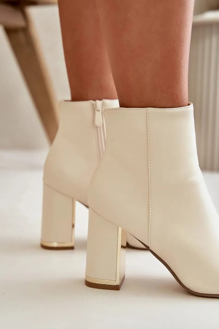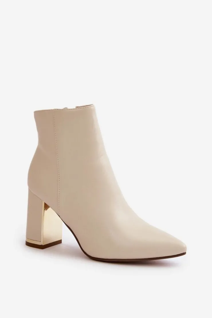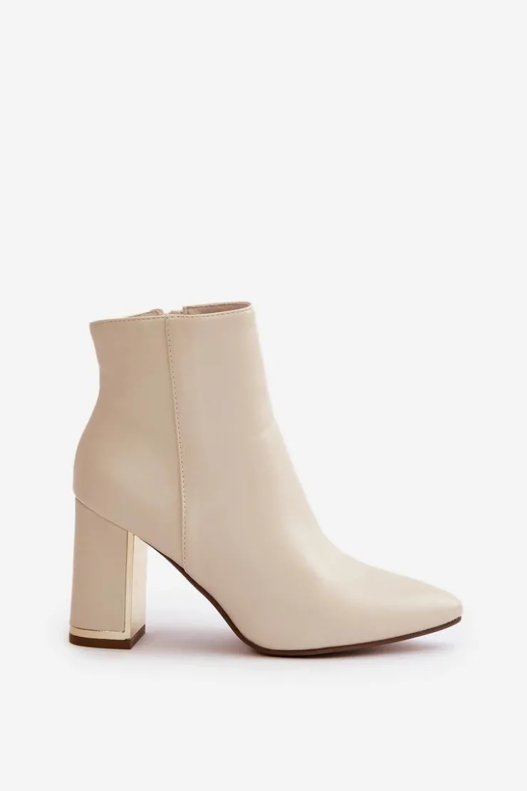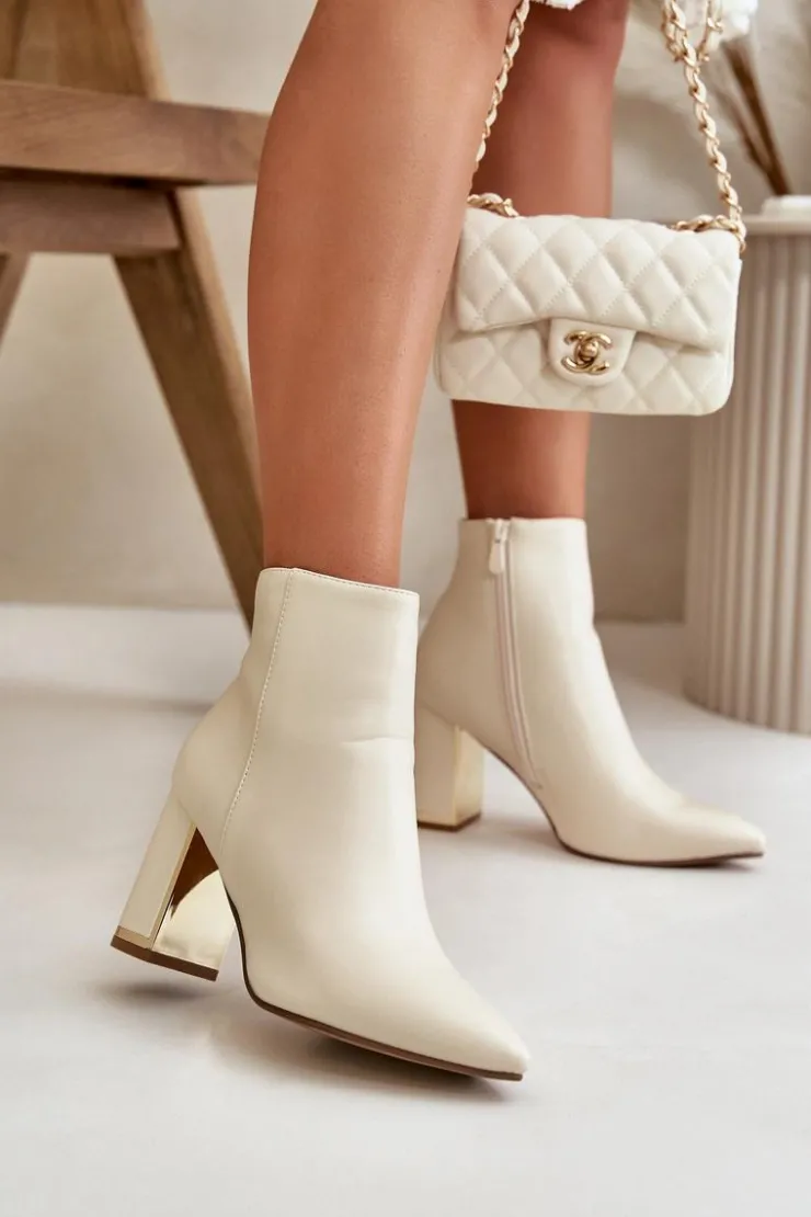 Damskie botki wykonane z eko skóry. Wnętrze jest ocieplane, co zapewnia ciepło i komfort w chłodniejsze dni. Noski w szpic nadają im stylowego charakteru, a obcas w formie stabilnego słupka jest dodatkowo ozdobiony lustrzanym elementem, co dodaje botkom wyjątkowego blasku i modnego akcentu. Koniecznie powinnaś je mieć w swojej jesienno-zimowej garderobie! Przy wyborze rozmiaru prosimy sugerować się tabelą rozmiarów.