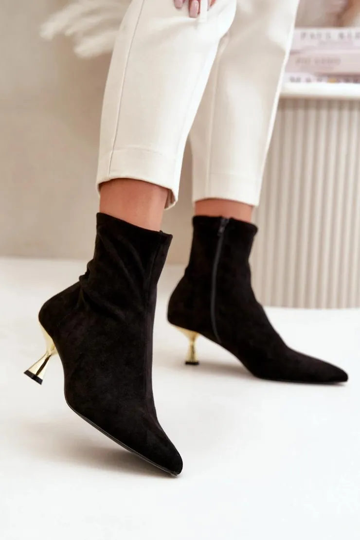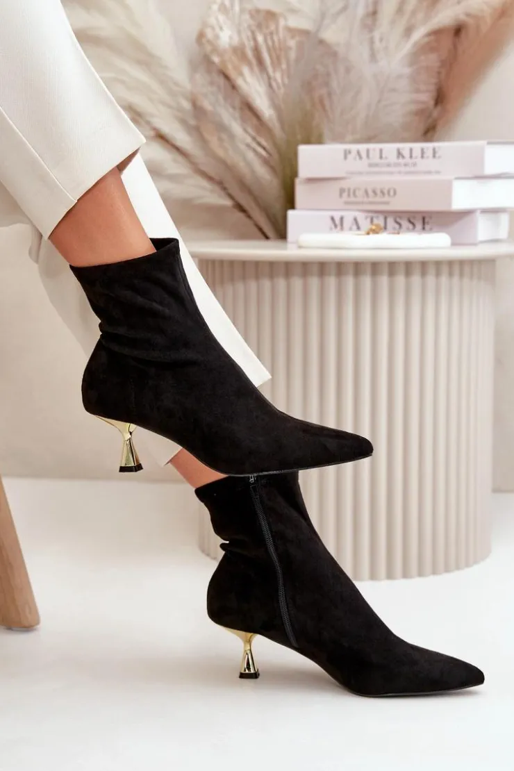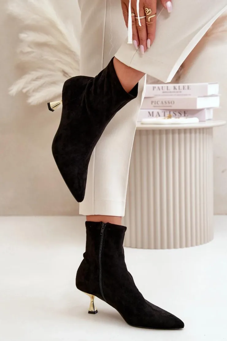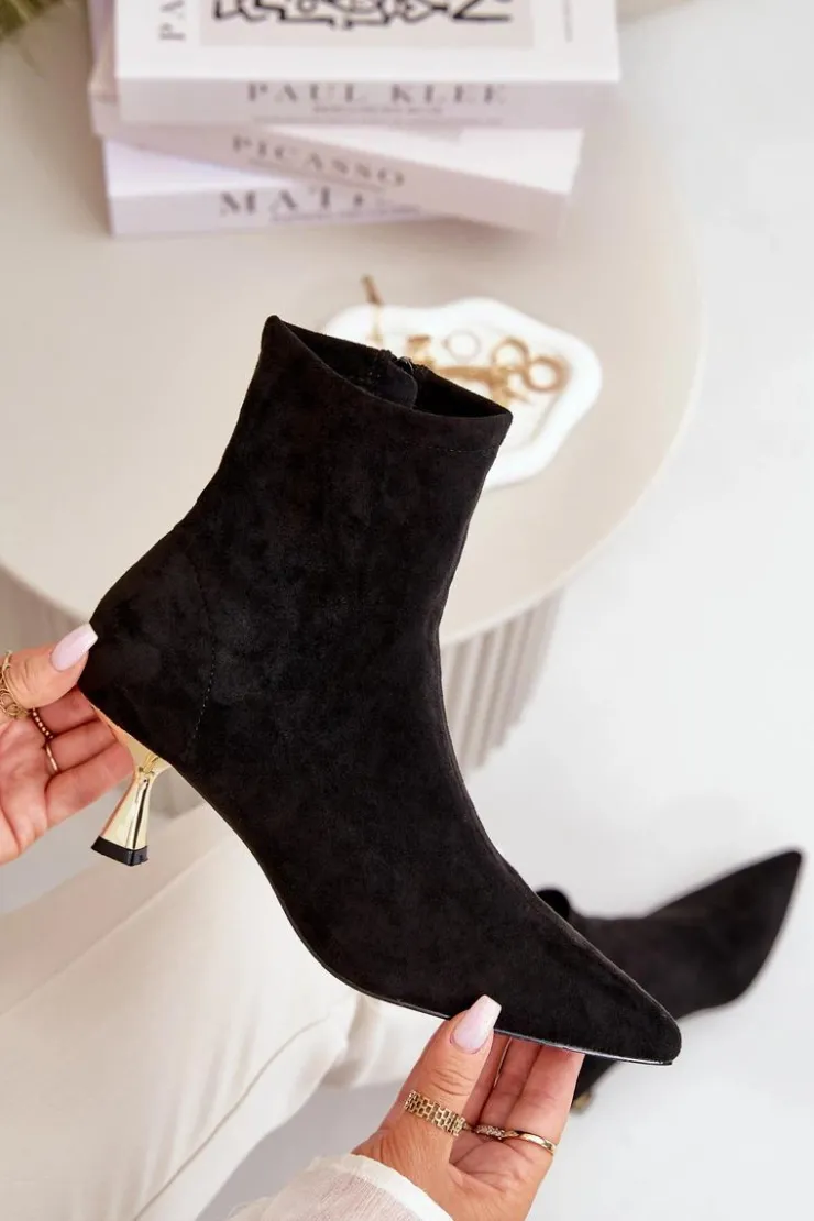 Stylowe botki damskie na ozdobnej szpilce to elegancki dodatek, który z pewnością przyciągnie spojrzenia. Wykonane z eko zamszu. Zapinane na zamek, który zapewnia wygodę i łatwość zakładania. Noski w szpic dodają wyrafinowanego charakteru, podkreślając kobiecość i smukłość sylwetki. Idealne na specjalne okazje, jak i do codziennych stylizacji, kiedy chcesz dodać sobie odrobinę elegancji. Przy wyborze rozmiaru prosimy sugerować się tabelą rozmiarów.