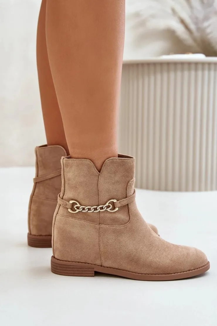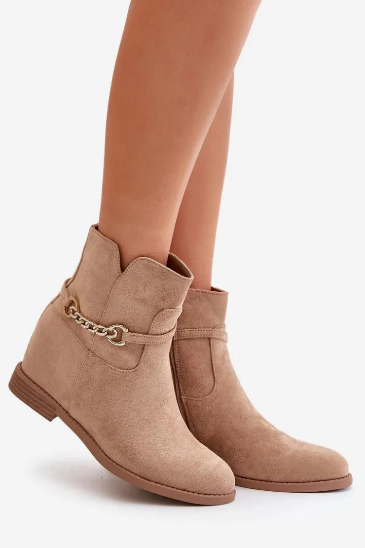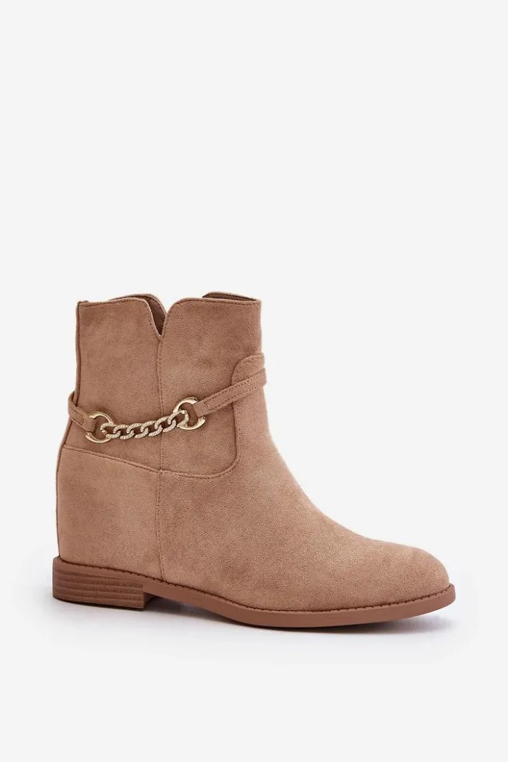Botki damskie wykonane z eko zamszu. Osadzone na płaskim obcasie i ukrytym koturnie. Noski zaokrąglone. Zapinane na zamek. Dodatkowym atutem tego modelu jest cienki paseczek ze złotym, krótkim łańcuszkiem. Przy wyborze rozmiaru prosimy sugerować się tabelą rozmiarów.