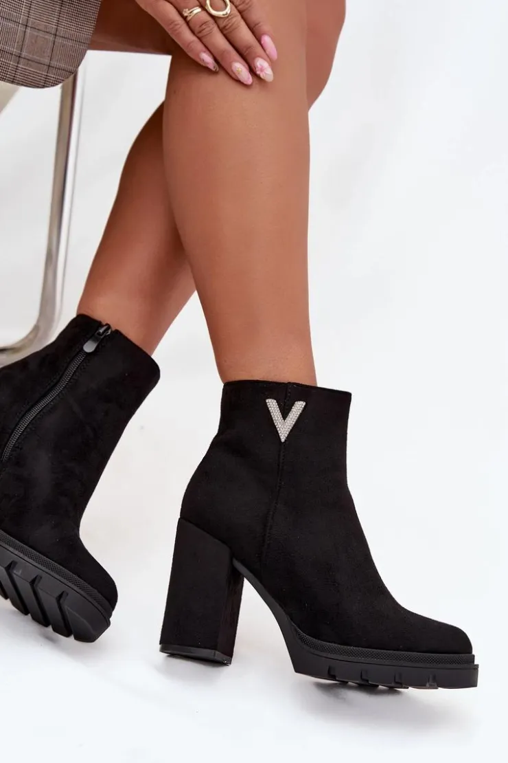 Botki damskie z eko zamszu to elegancka propozycja dla kobiet ceniących styl i wygodę. Osadzone na stabilnym obcasie typu słupek, zapewniają komfort noszenia i subtelnie podkreślają sylwetkę. Zaokrąglone noski nadają im klasycznego charakteru, a praktyczny zamek ułatwia zakładanie i zdejmowanie. Uwagę przyciąga błyszczący detal w kształcie litery V umieszczony z boku cholewki, który dodaje oryginalności i modnego akcentu. To model doskonały zarówno do codziennych, jak i eleganckich stylizacji.