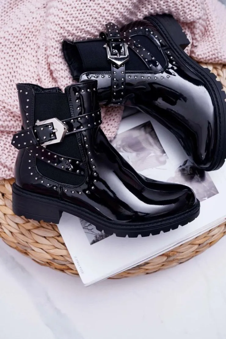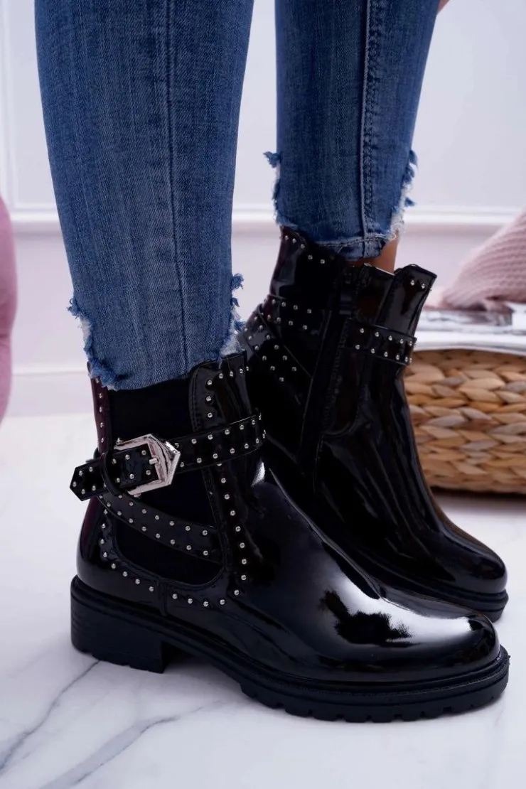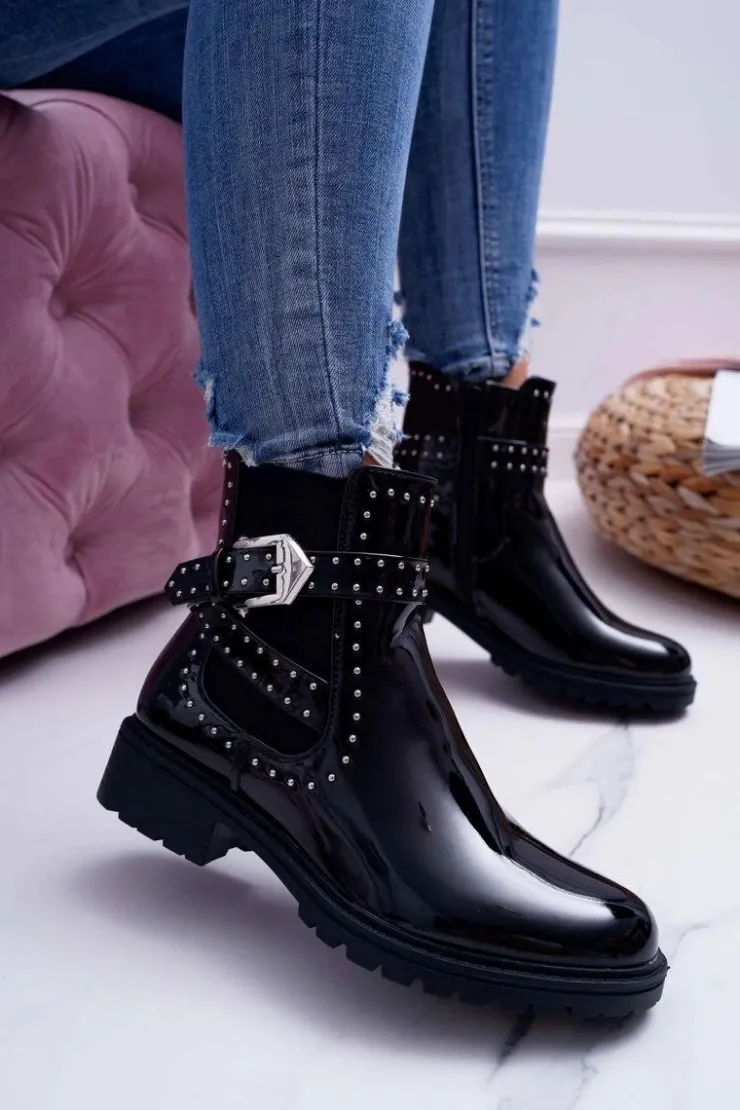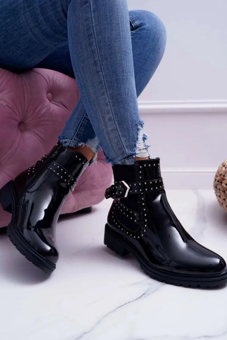 Mamy dla Was coś wyjątkowego! Lakierowane botki z suwakiem na boku, które świetnie wpasują się w nadchodzące trendy. Wykonane z wysokiej jakości skóry ekologicznej. Zdobienia w postaci pasków z nitami nadają im niesamowitego mocnego charakteru. Wnętrze pokryte kocem obuwniczym z krótkim futerkiem. Przy wyborze rozmiaru prosimy sugerować się tabelą rozmiarów, która dostępna jest po najechaniu bądź kliknięciu w dany rozmiar.