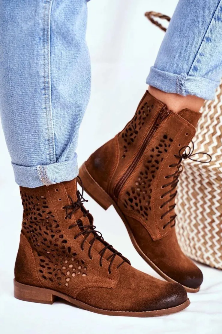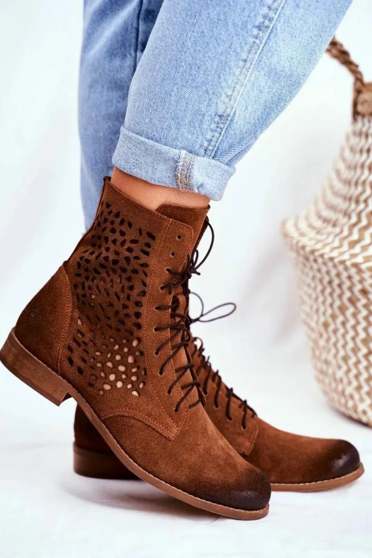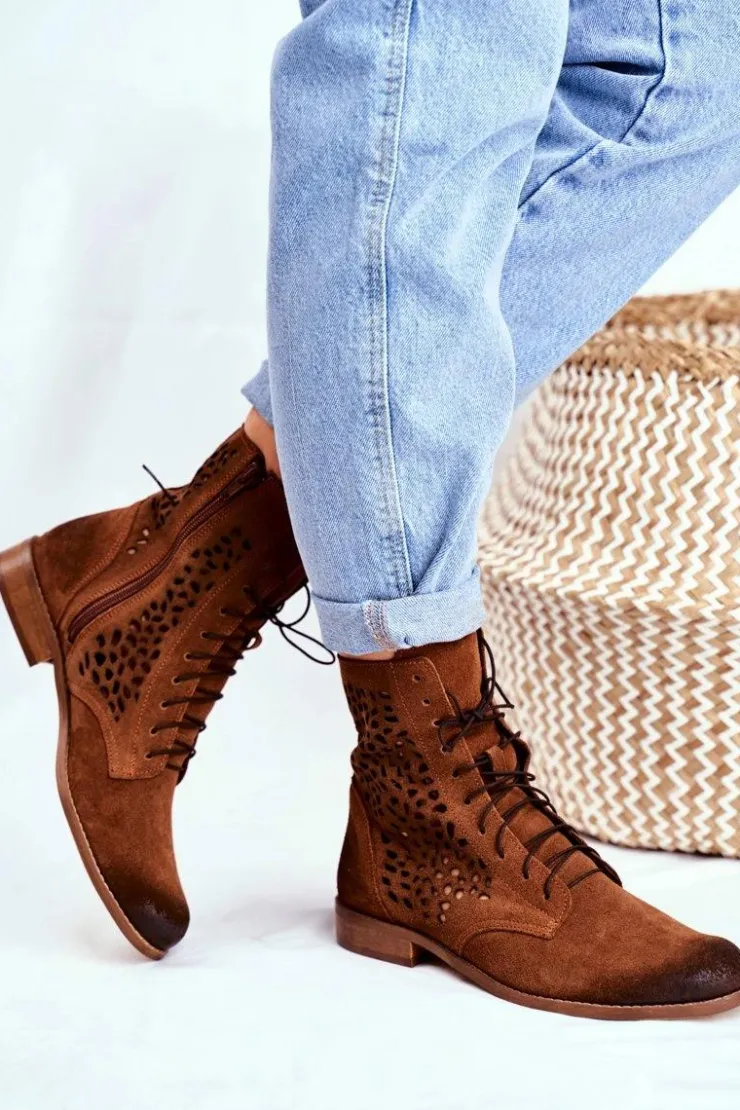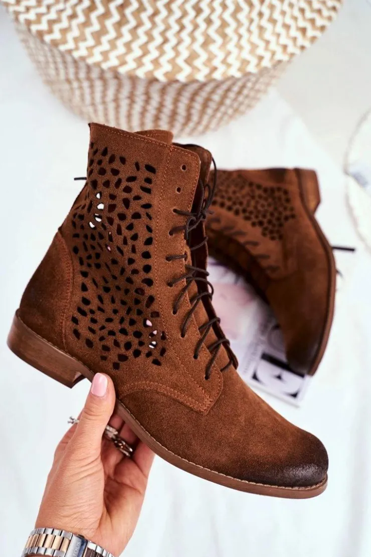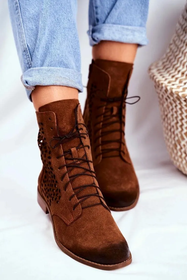 Botki to nie tylko buty na chłodne dni. Świetnie sprawdzą się również podczas tworzenia wiosennych stylizacji. Produkt polski, wykonany w całości ze skóry zamszowej. Delikatny, płaski obcas uniesie Twoją sylwetkę i podkreśli stylizacje. Ażurowy styl nigdy nie wyjdzie z mody. Idealne do zwiewnych sukienek oraz jeansowych spodni. Przy wyborze rozmiaru prosimy sugerować się tabelą rozmiarów.