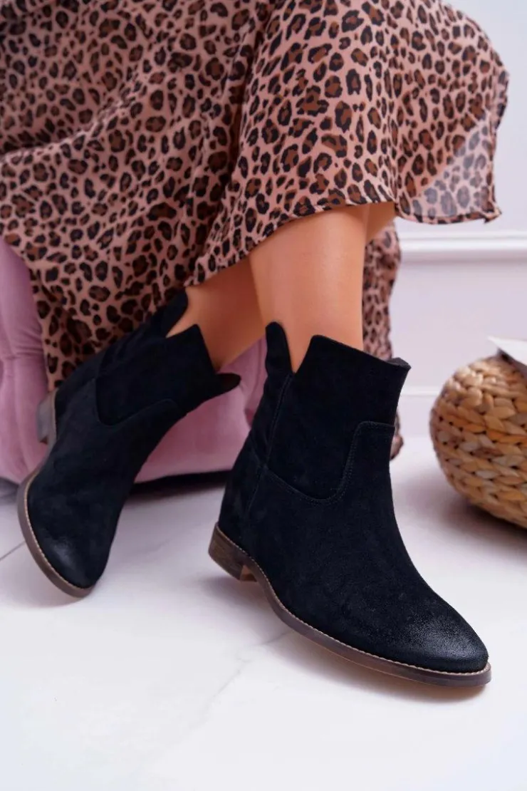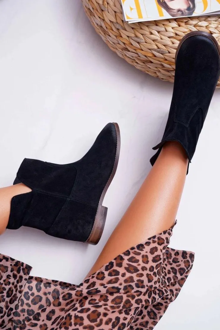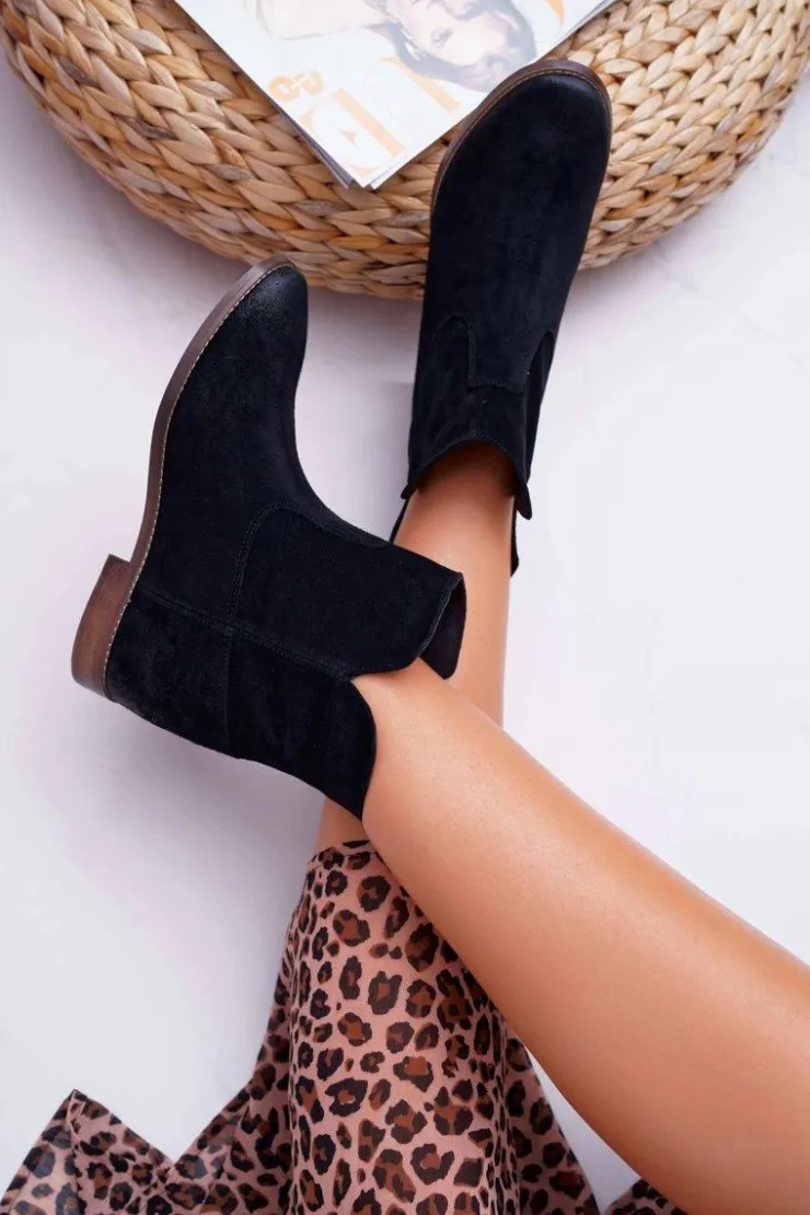 Wsuwane botki w stylu kowbojek nigdy nie wychodzą z mody. Są z nami w każdym sezonie i zawsze wyglądają oszałamiająco! Delikatny płaski obcas oraz ukryty wewnątrz koturn, idealnie uniesie i wyeksponuje naszą sylwetkę. Botki wykonane w całości z naturalnej skóry zamszowej. Wkładka to również skóra, która da nam dodatkowe poczucie komfortu. Przy wyborze rozmiaru prosimy sugerować się tabelą rozmiarów, która dostępna jest po najechaniu bądź kliknięciu w dany rozmiar.