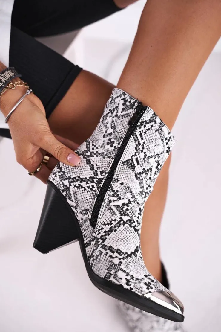 Niezwykle stylowe botki, obok których nikt nie przejdzie obojętnie! Na pewno przykują uwagę swoim niecodziennym designem. Posiadają stalowy nosek, oraz niecodzienny słupek. Nie czekaj dłużej i kup teraz w doskonałej cenie! Zakładanie ułatwi wszyty na boku suwak. Dostępne w klasycznej czarnej wersji oraz w wersji z printem white snake. Przy wyborze rozmiaru prosimy sugerować się tabelą rozmiarów.