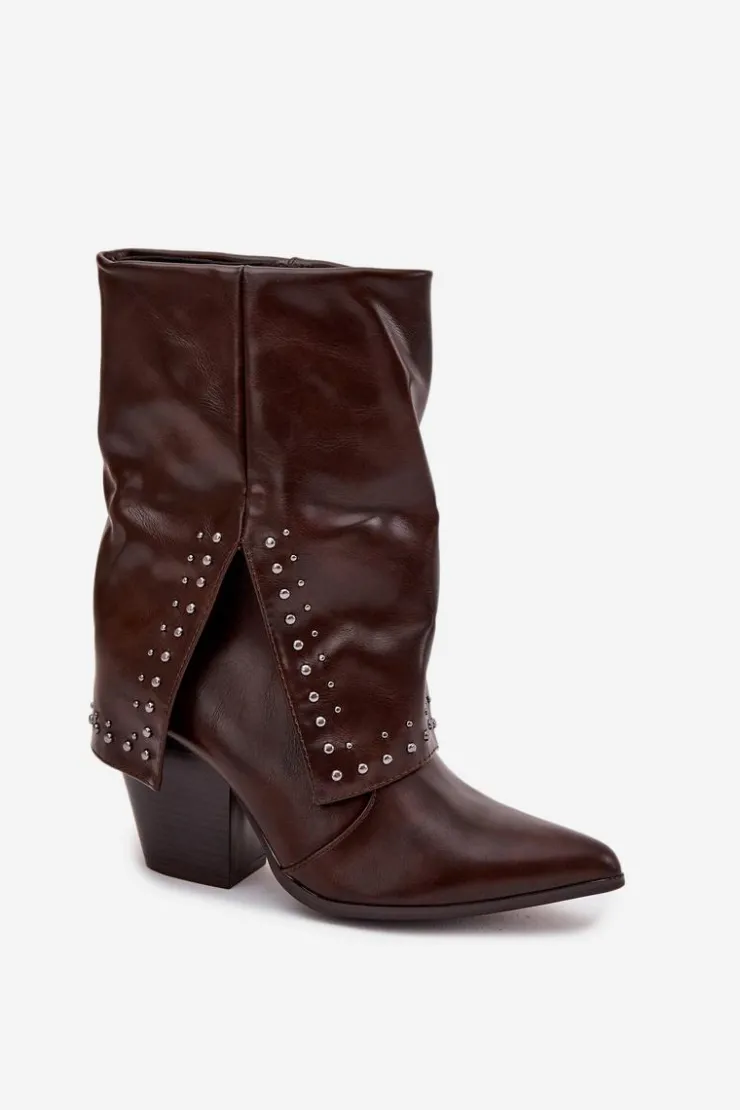 Botki damskie w stylu kowbojek, wykonane z eko skóry to modna propozycja na sezon jesienno-zimowy. Model osadzony został na stabilnym, ściętym obcasie typu słupek, który podkreśla charakter westernowego stylu. Wywinięta cholewka ze zdobieniem nadaje oryginalnego i stylowego wyglądu. Botki są wsuwane, a dodatkowy suwak ułatwia zakładanie i zdejmowanie. Wnętrze ocieplone pianką pokrytą tkaniną zapewnia komfort i ciepło w chłodniejsze dni. To wyjątkowy model, który łączy wygodę z ponadczasowym stylem – idealny zarówno do jeansów, jak i do sukienek w stylu boho.