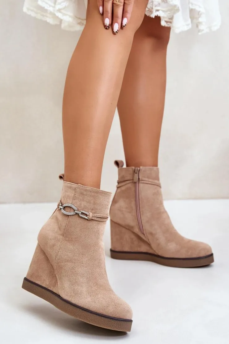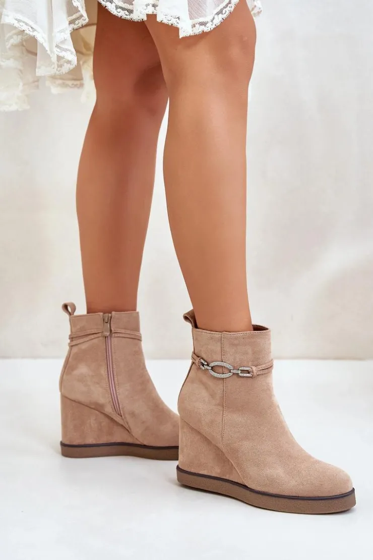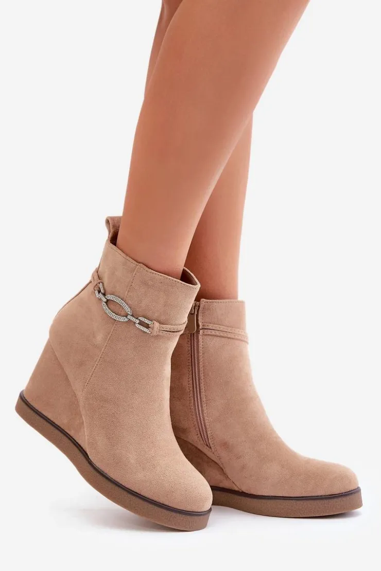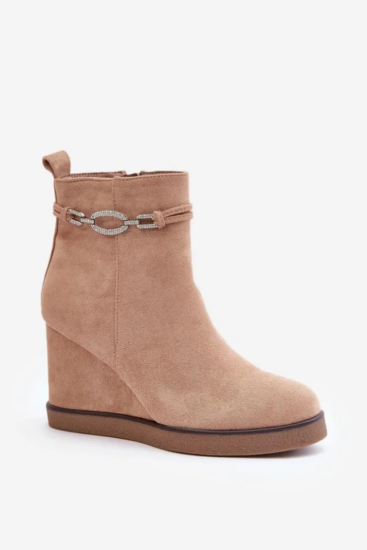 Botki damskie wykonane z eko zamszu, prezentują się niezwykle elegancko. Zapinanie na zamek ułatwia szybkie i wygodne zakładanie oraz zdejmowanie. Osadzone na koturnie. Zapiętek został usztywniony dla dodatkowego wsparcia, a zaokrąglone noski dodają klasycznego uroku. Na cholewce ozdobny paseczek. Wnętrze jest ocieplone kocem obuwniczym, co gwarantuje ciepło i komfort nawet w najchłodniejsze dni. Przy wyborze rozmiaru prosimy sugerować się tabelą rozmiarów.