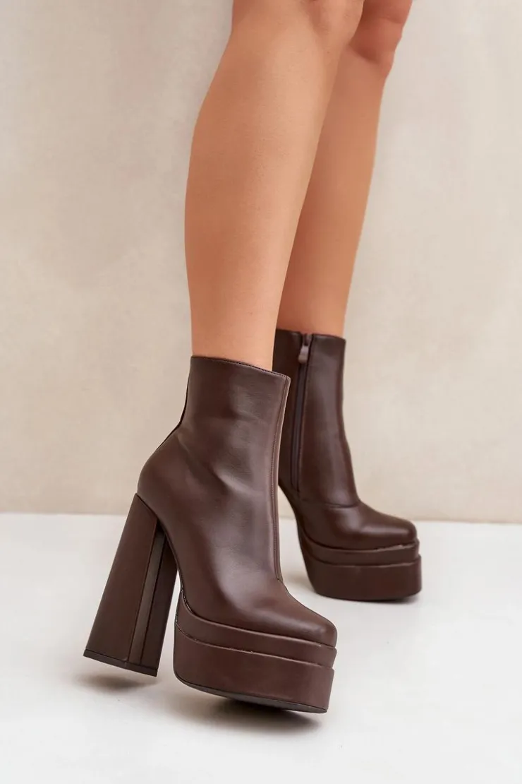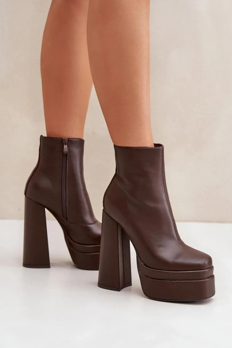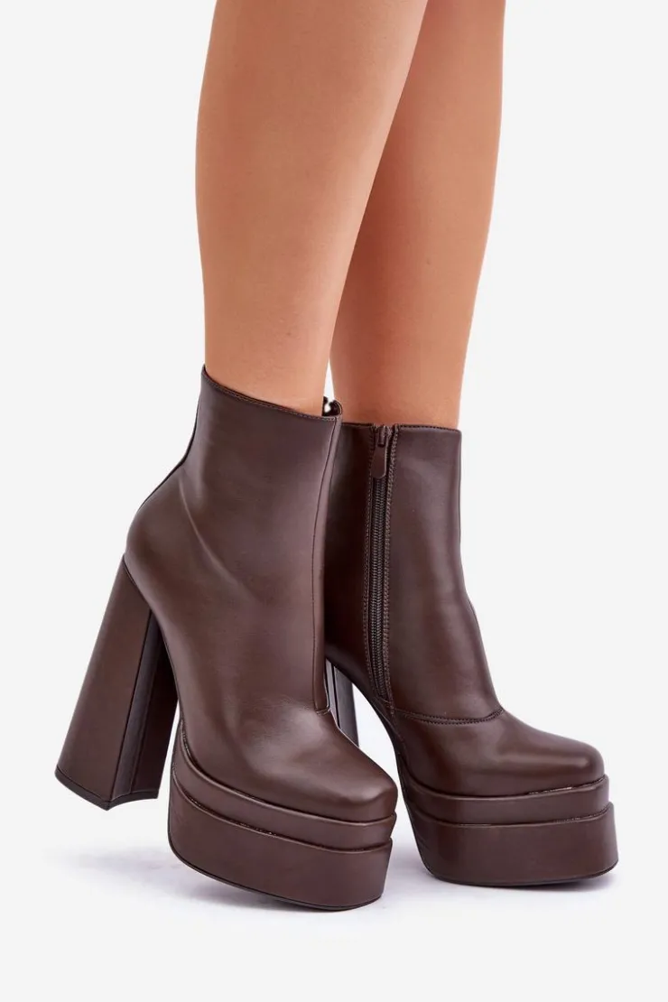 Botki damskie wykonane z eko skóry, osadzone na masywnej platformie i wysokim obcasie, które dodają charakteru każdej stylizacji. Model z zaokrąglonymi noskami zapewnia komfort noszenia. Wnętrze ocieplane kocem obuwniczym, idealne na chłodniejsze dni. Praktyczne zapięcie na zamek ułatwia zakładanie. Stylowe i wygodne, doskonałe na co dzień i specjalne okazje. Przy wyborze rozmiaru prosimy sugerować się tabelą rozmiarów.