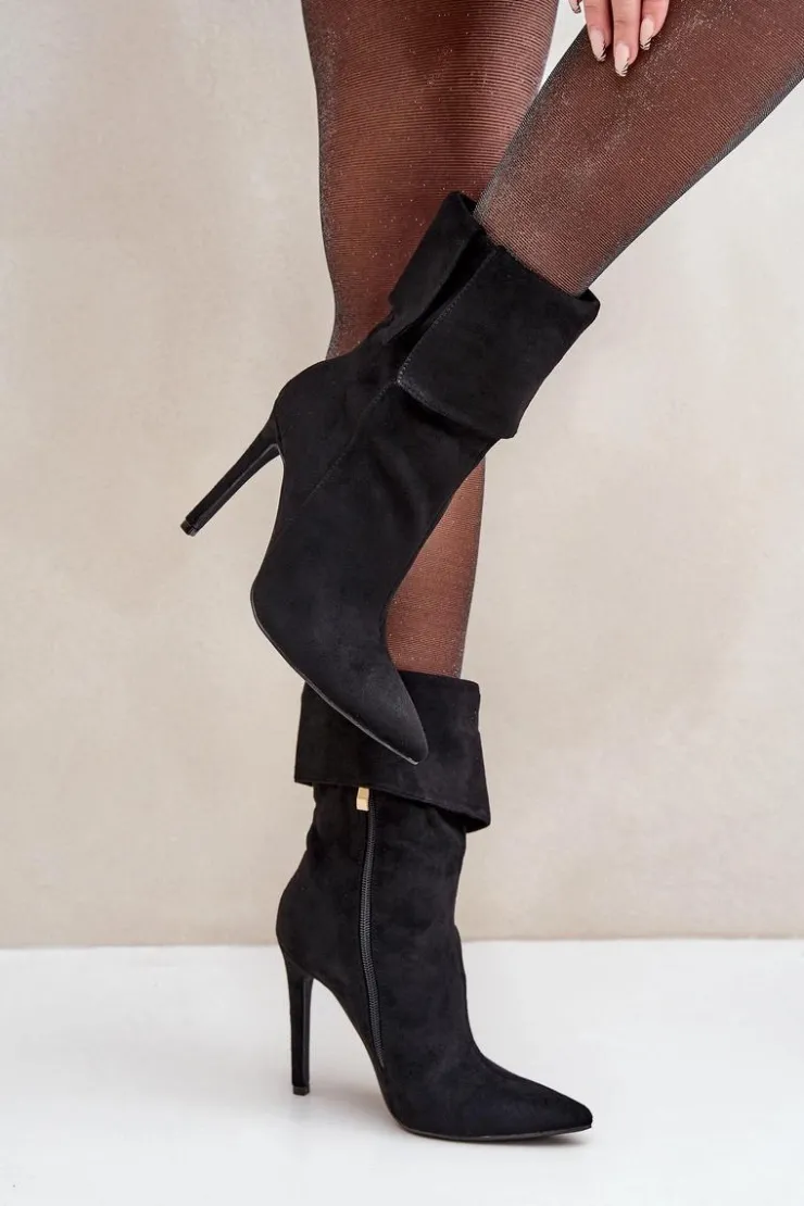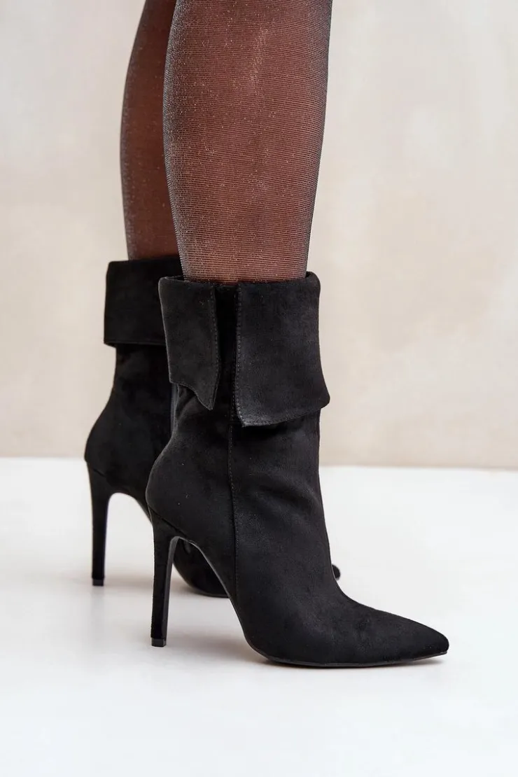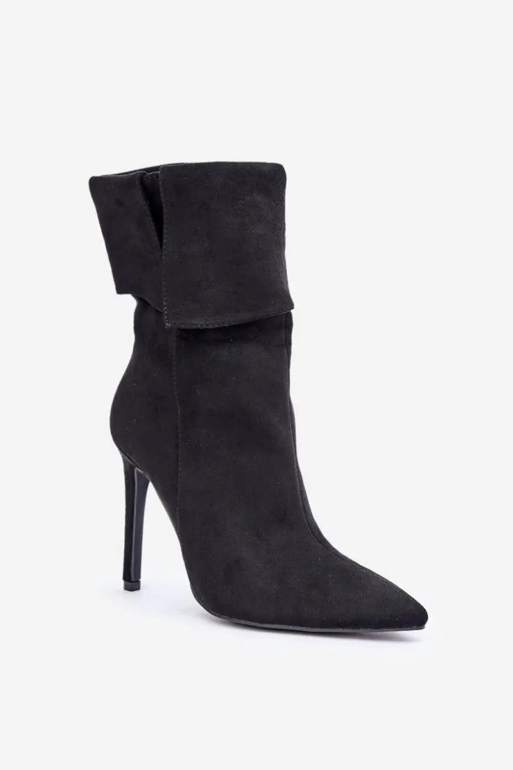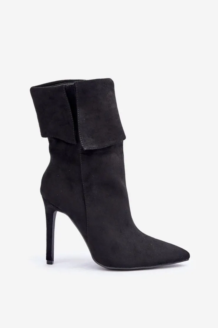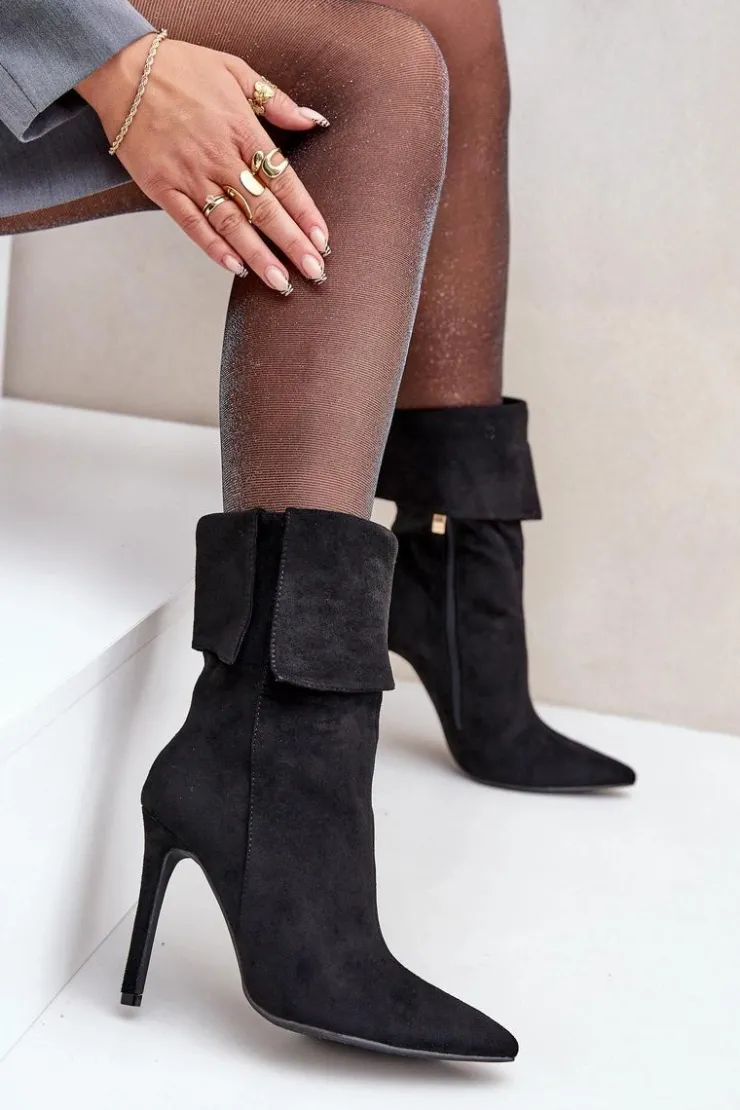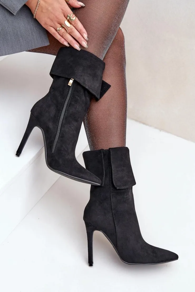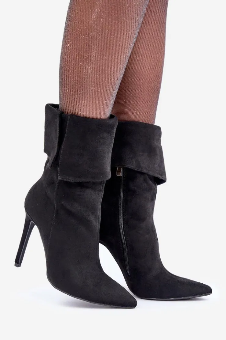 Eleganckie botki damskie wykonane z miękkiego eko zamszu. Osadzone na smukłej szpilce, która dodaje klasy i wydłuża sylwetkę. Góra cholewki wywinięta, co nadaje modelowi oryginalnego charakteru. Model wsuwany, dodatkowo posiada zapięcie na zamek. Szpiczaste noski. Idealne na wieczorne wyjścia oraz do formalnych stylizacji. Przy wyborze rozmiaru prosimy sugerować się tabelą rozmiarów.