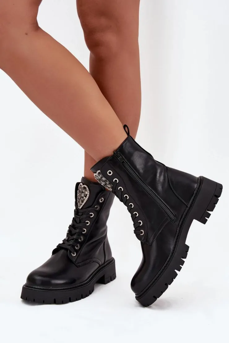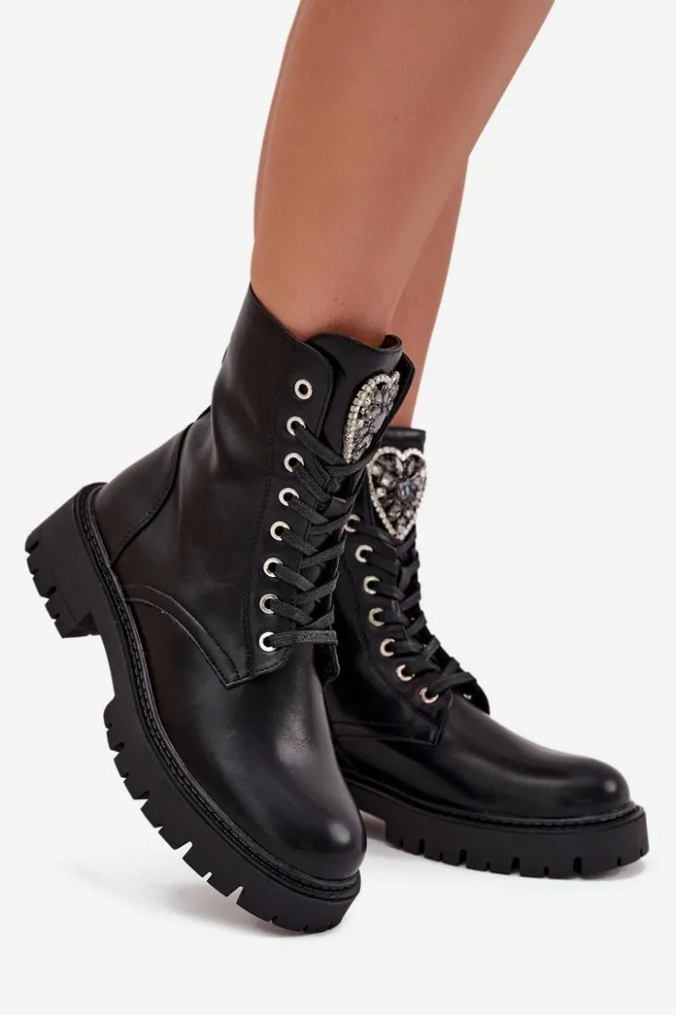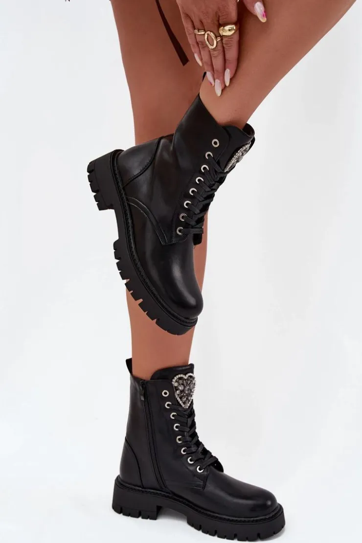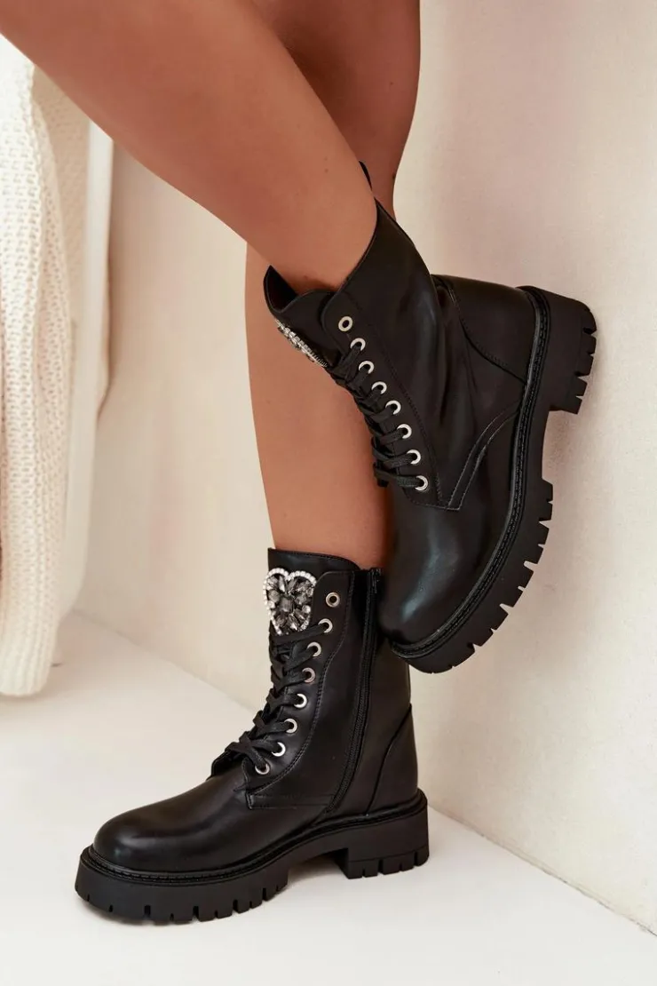 Botki damskie wykonane z eko skóry to modna i wygodna opcja na jesień i zimę. Ocieplone kocem obuwniczym, zapewniają ciepło i komfort w chłodniejsze dni. Cholewka za kostkę, sznurowanie z przodu oraz dodatkowy zamek błyskawiczny na boku cholewki zapewniają łatwe dopasowanie i wygodne zakładanie. Osadzone na płaskim obcasie i platformie, gwarantują stabilność przez cały dzień. Biżuteryjna ozdoba na języku dodaje im eleganckiego akcentu. Te botki doskonale komponują się z różnymi stylizacjami, będąc świetnym wyborem na sezon jesienno-zimowy. Przy wyborze rozmiaru prosimy sugerować się tabelą rozmiarów.