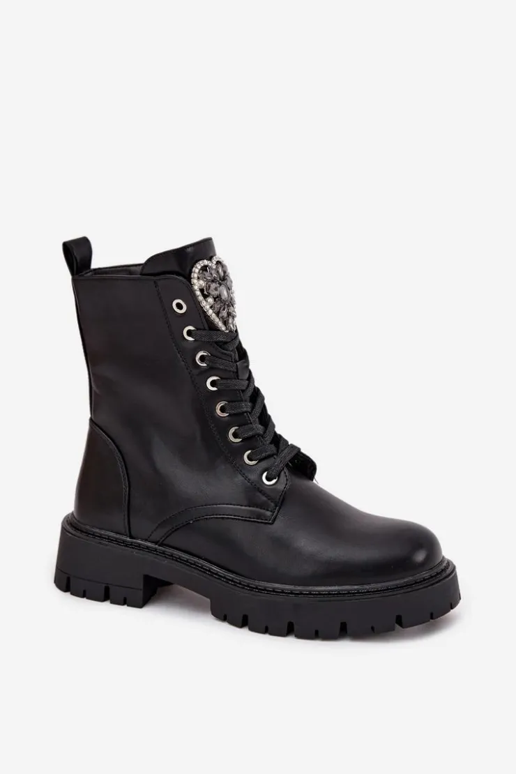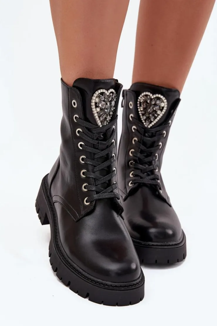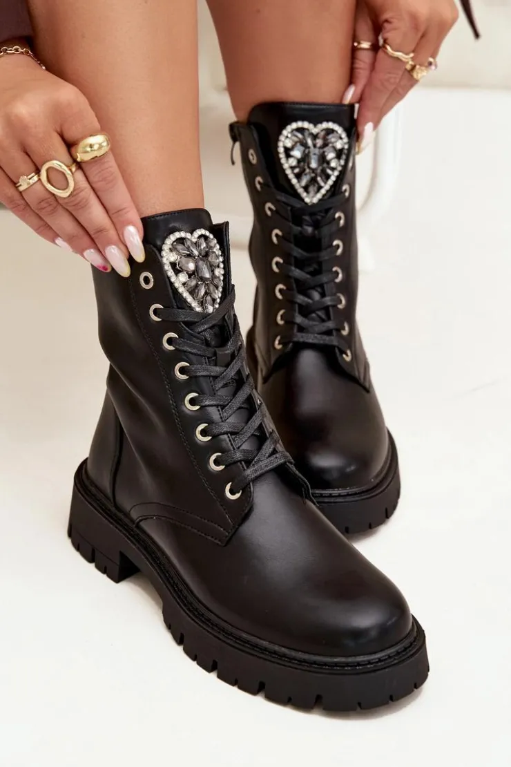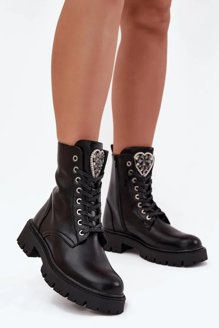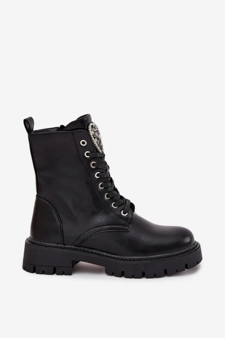 Botki damskie wykonane z eko skóry to modna i wygodna opcja na jesień i zimę. Ocieplone kocem obuwniczym, zapewniają ciepło i komfort w chłodniejsze dni. Cholewka za kostkę, sznurowanie z przodu oraz dodatkowy zamek błyskawiczny na boku cholewki zapewniają łatwe dopasowanie i wygodne zakładanie. Osadzone na płaskim obcasie i platformie, gwarantują stabilność przez cały dzień. Biżuteryjna ozdoba na języku dodaje im eleganckiego akcentu. Te botki doskonale komponują się z różnymi stylizacjami, będąc świetnym wyborem na sezon jesienno-zimowy. Przy wyborze rozmiaru prosimy sugerować się tabelą rozmiarów.