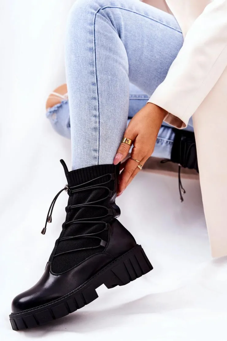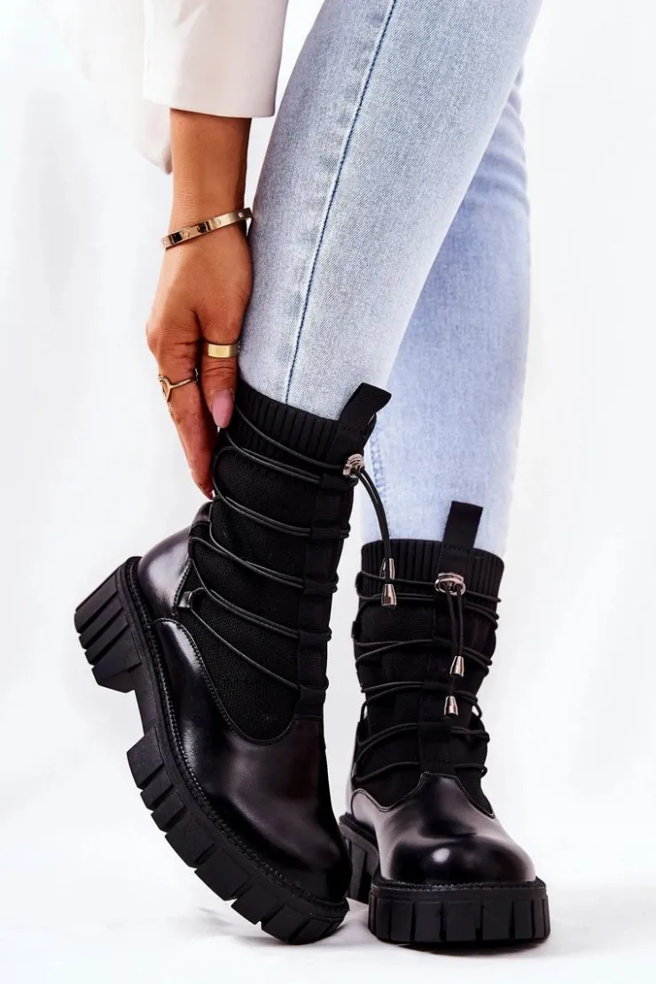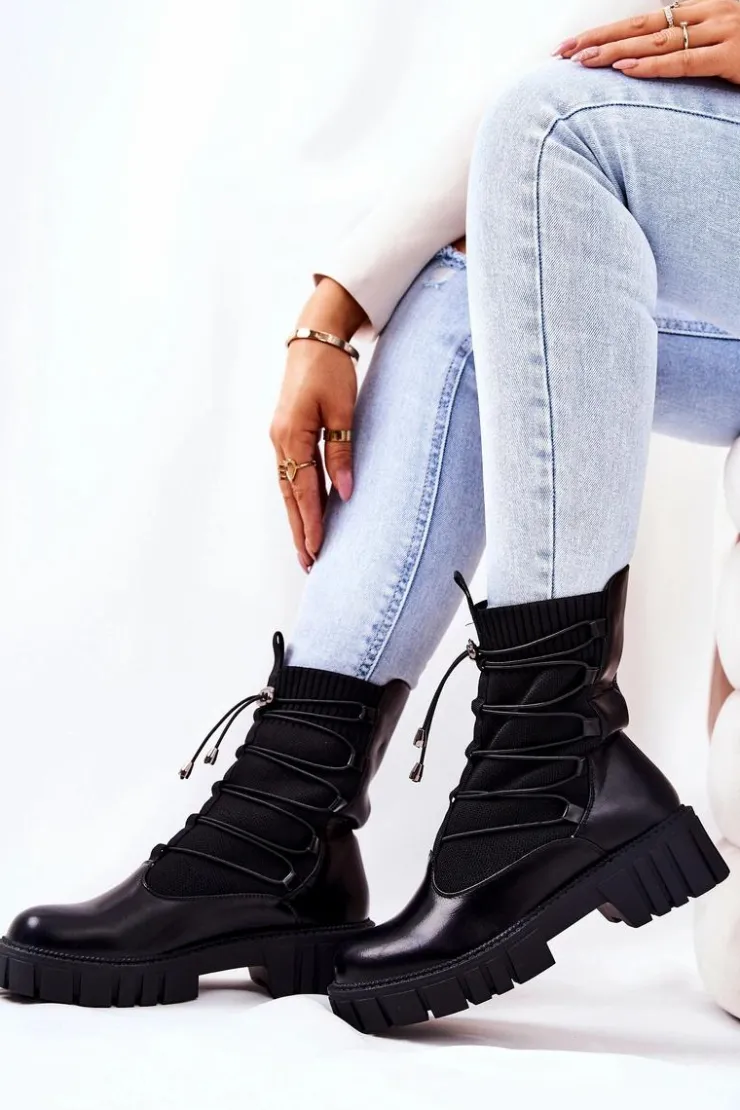 Świetne botki, które spełnią Twoje wymagania! Miękka skarpetowa cholewka oraz masywna podeszwa – ten model wyrazi Twój charakter! Modny fason z gumką ze ściągaczem u góry cholewki. Wykonane z eko skóry oraz tkaniny. Delikatne ocieplenie w postaci futerka zapewni ochronę przed zimnem. Koniecznie musisz je mieć! Przy wyborze rozmiaru prosimy sugerować się tabelą rozmiarów.