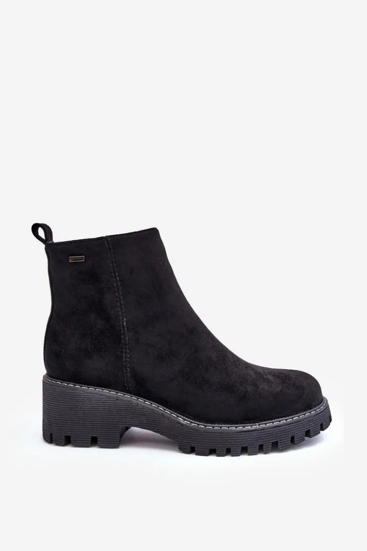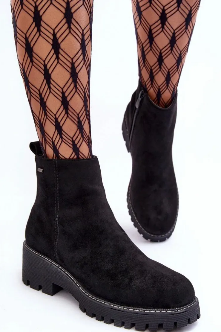 Klasyczne botki damskie osadzone na płaskim, stabilnym obcasie i platformie. Wykonane z eko zamszu. Zapinane na suwak po wewnętrznej stronie cholewki. Zapiętek jest usztywniony, noski zaokrąglone. Wnętrze ocieplone kocem obuwniczym. Świetny model na chłodniejsze dni! Przy wyborze rozmiaru prosimy sugerować się tabelą rozmiarów.