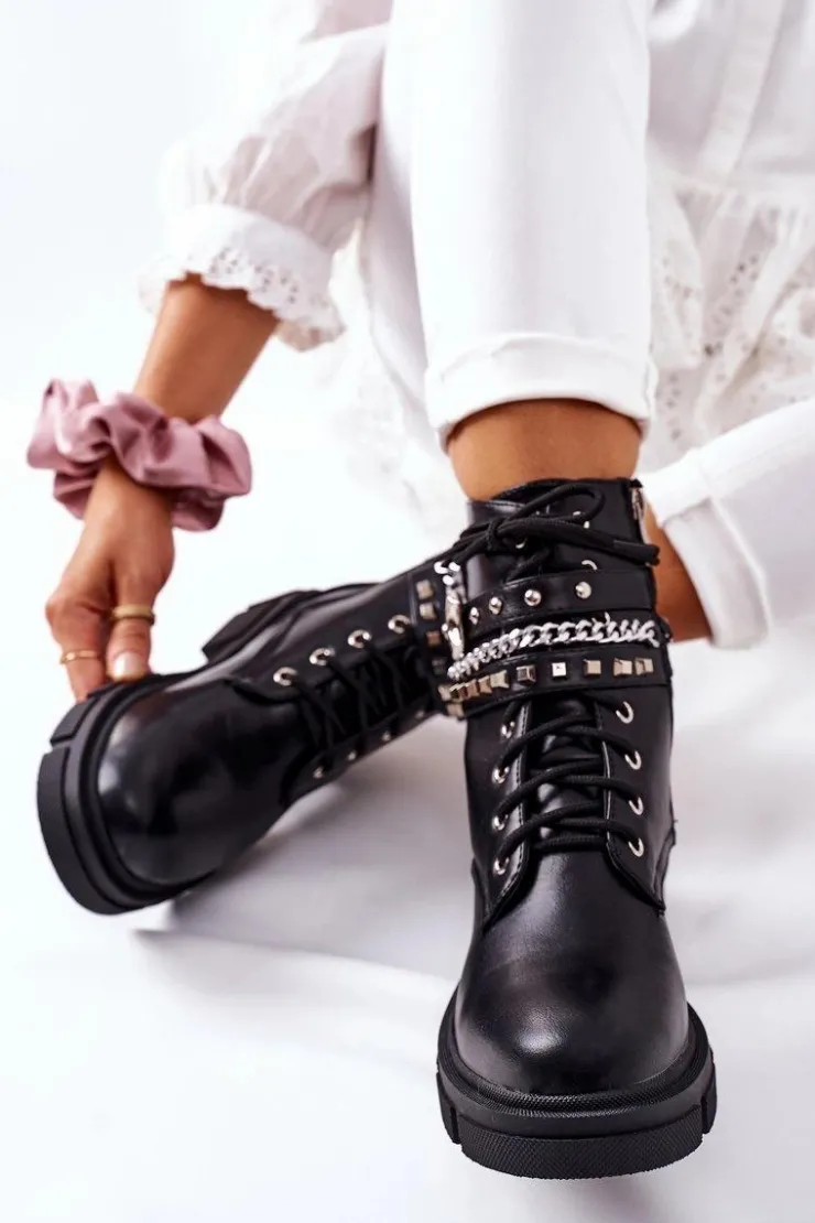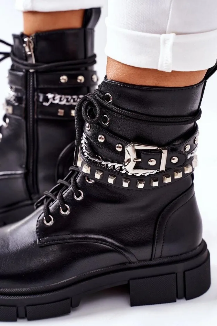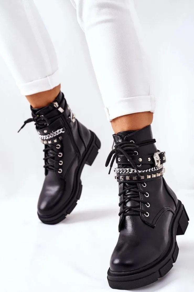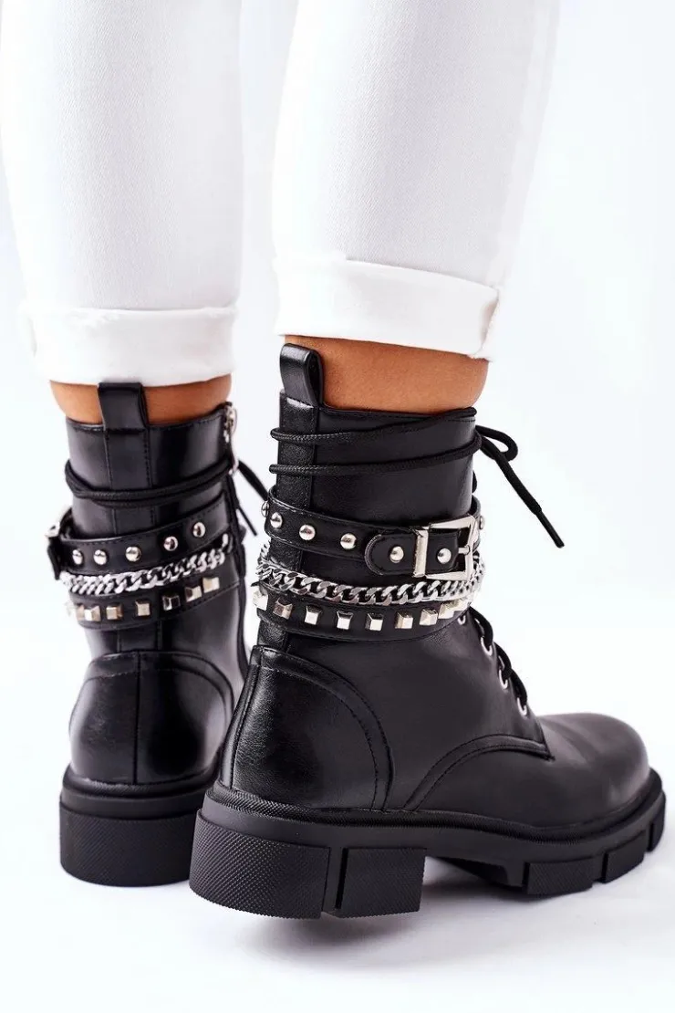 Niezwykłe i stylowe botki wykonane ze skóry ekologicznej. Zapinane na zamek oraz klamrę. Dodatkowy ozdobny łańcuch na cholewce. Przy wyborze rozmiaru prosimy sugerować się tabelą rozmiarów.