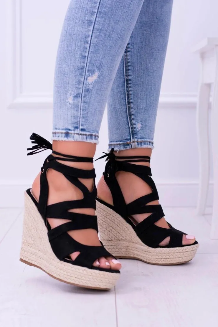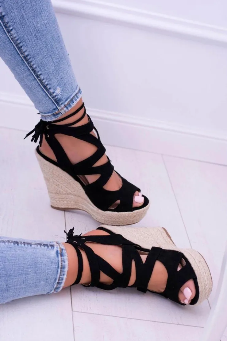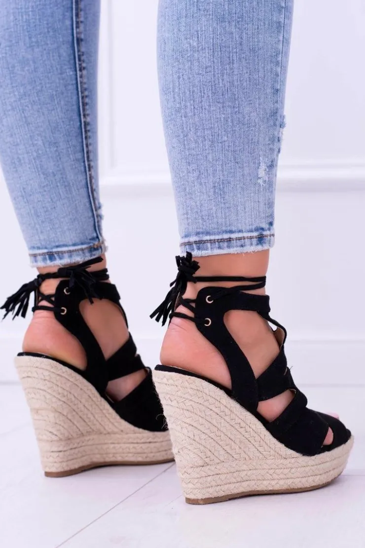 Damskie Boto Czarne Zamszowe Sandały Na Koturnie Nowelio