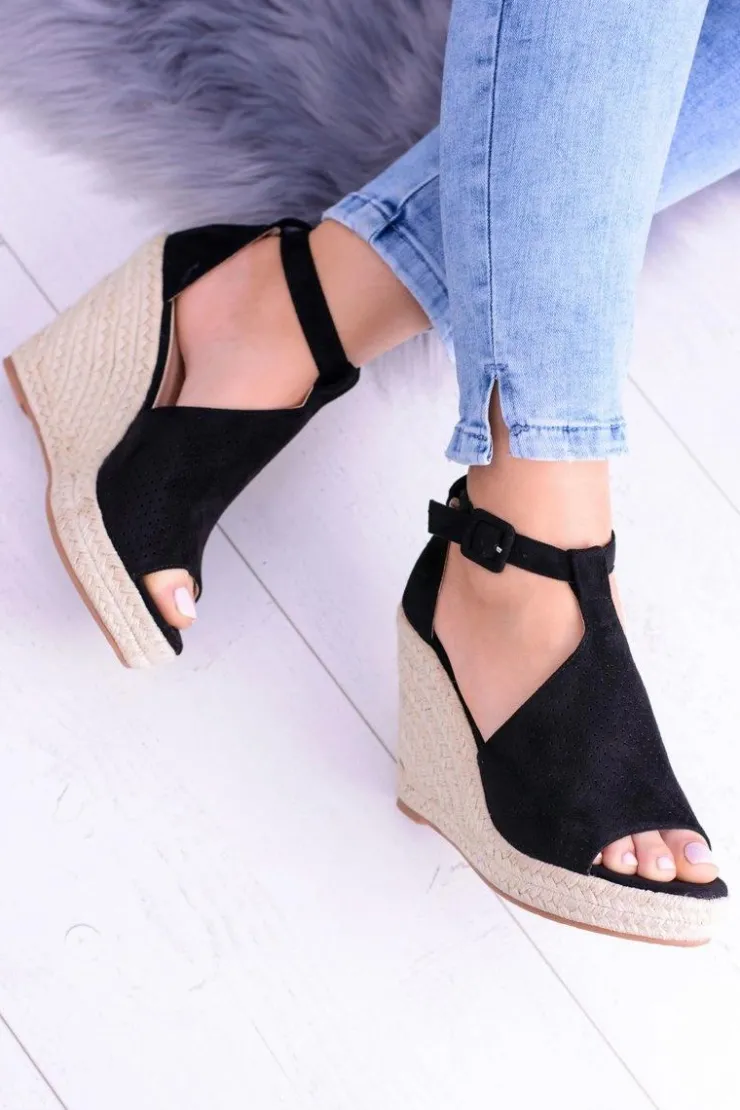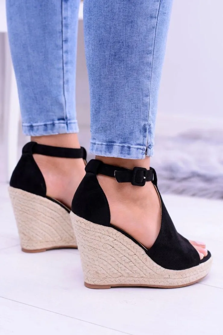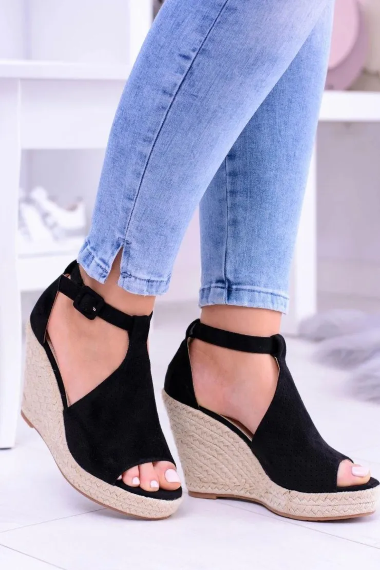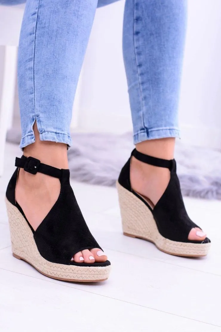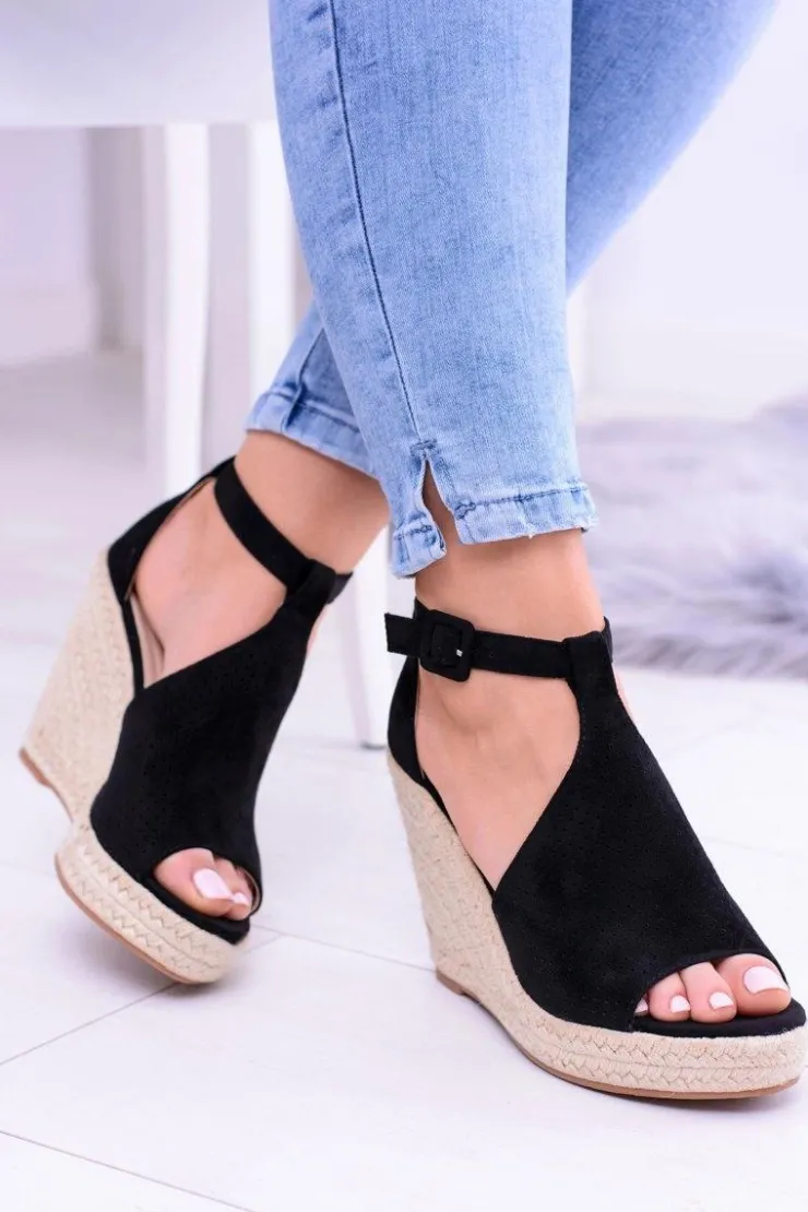 Damskie Boto Czarne Zamszowe Sandały Na Koturnie Sunlast