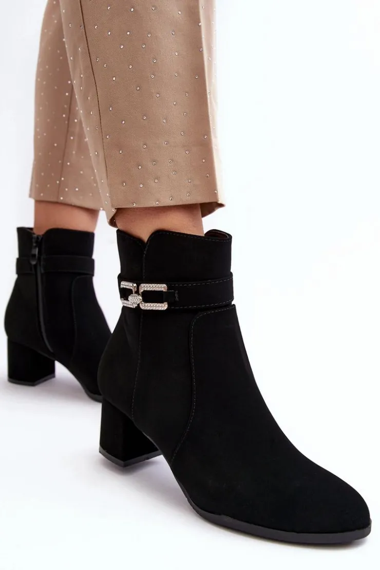 Damskie botki z cholewką za kostkę wykonane z eko skóry. Osadzone na niskim słupku. Noski zaokrąglone. Zapinane suwakiem z boku. Na cholewce pasek z ozdobą. Klasyczny model, idealny do wielu jesiennych stylizacji! Przy wyborze rozmiaru prosimy sugerować się tabelą rozmiarów.