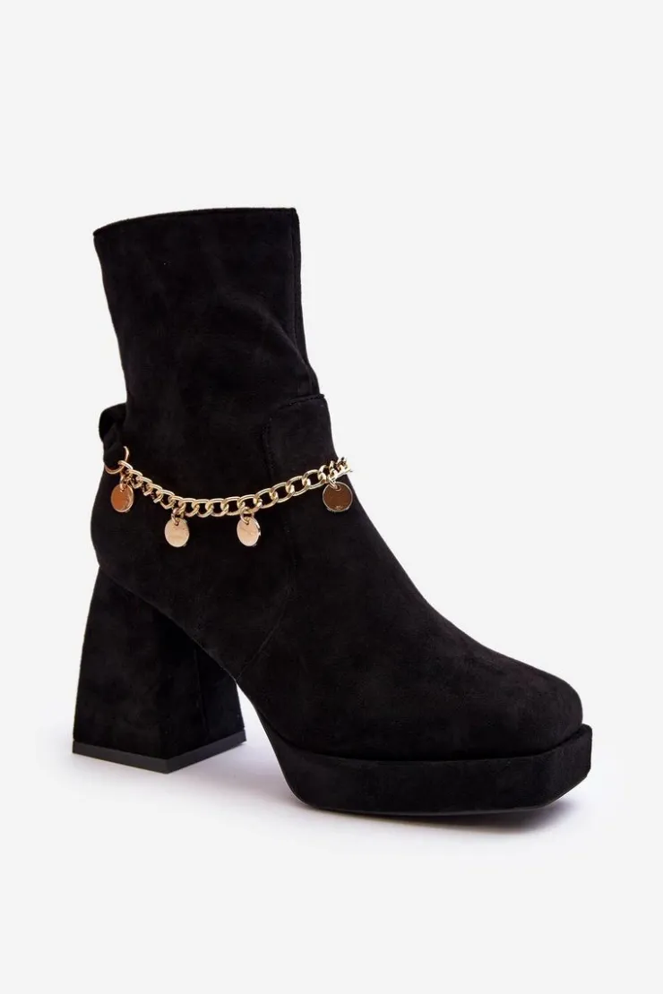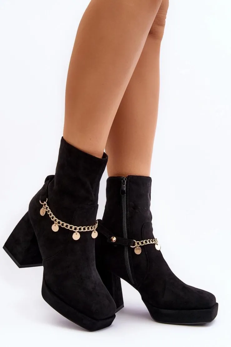 Botki damskie zostały wykonane z eko zamszu, co nadaje im eleganckiego wyglądu. Charakteryzują się solidnym obcasem typu klocek oraz noskami w kształcie kwadratu, dodającymi nutę nowoczesności. Usztywniony zapiętek zapewnia stabilność i wygodę podczas użytkowania. Cholewka ozdobiona łańcuszkiem. Botki te będą idealnym dodatkiem do jesiennych stylizacji! Przy wyborze rozmiaru prosimy sugerować się tabelą rozmiarów.