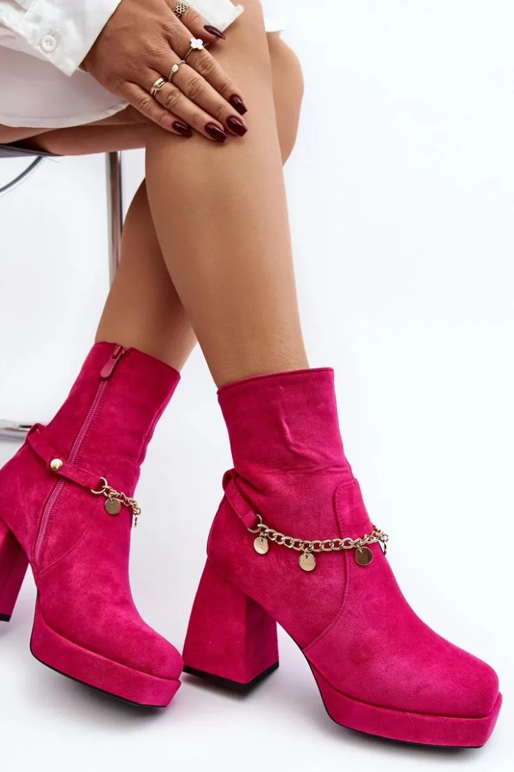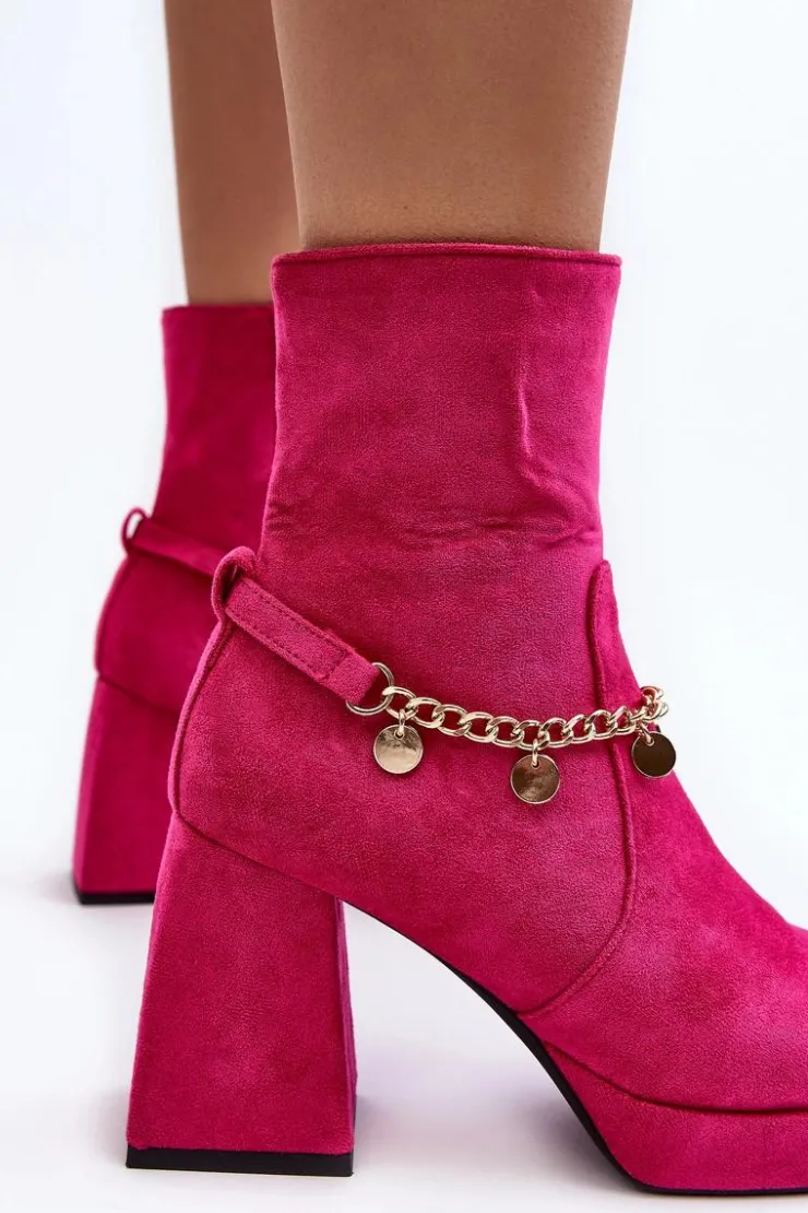 Botki damskie zostały wykonane z eko zamszu, co nadaje im eleganckiego wyglądu. Charakteryzują się solidnym obcasem typu klocek oraz noskami w kształcie kwadratu, dodającymi nutę nowoczesności. Usztywniony zapiętek zapewnia stabilność i wygodę podczas użytkowania. Cholewka ozdobiona łańcuszkiem. Botki te będą idealnym dodatkiem do jesiennych stylizacji! Przy wyborze rozmiaru prosimy sugerować się tabelą rozmiarów.